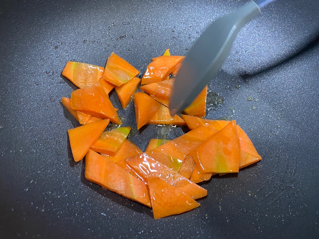 步骤1、猪肚水滚后下锅绰一下水,胡萝卜洗净切片;