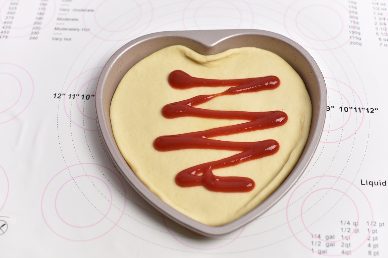 步骤9、醒发好的饼皮上戳几个小孔,挤上番茄沙司,刷开。