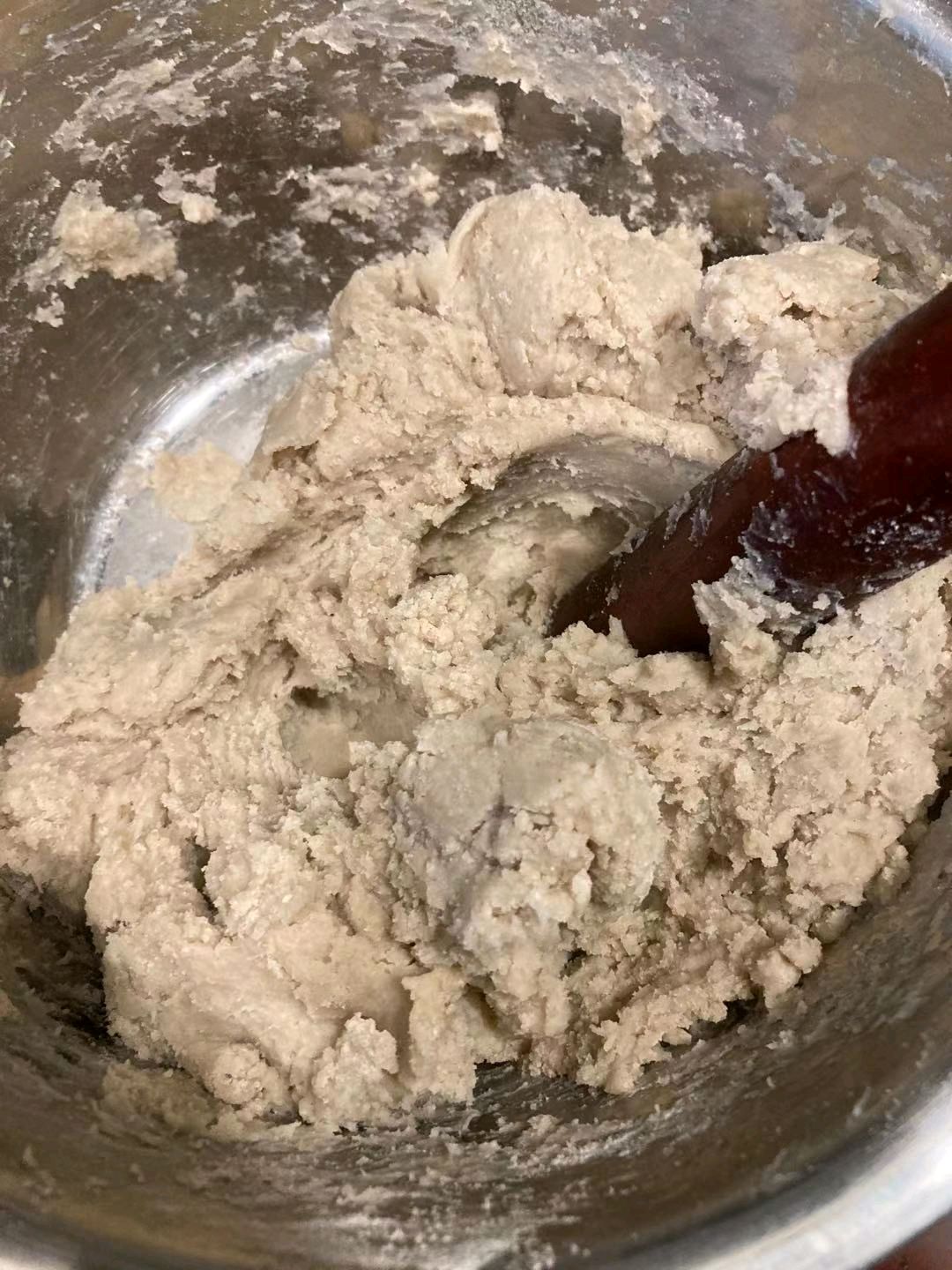 步骤1、将滚烫的开水倒入莜面中,面与水的比例是1:1。