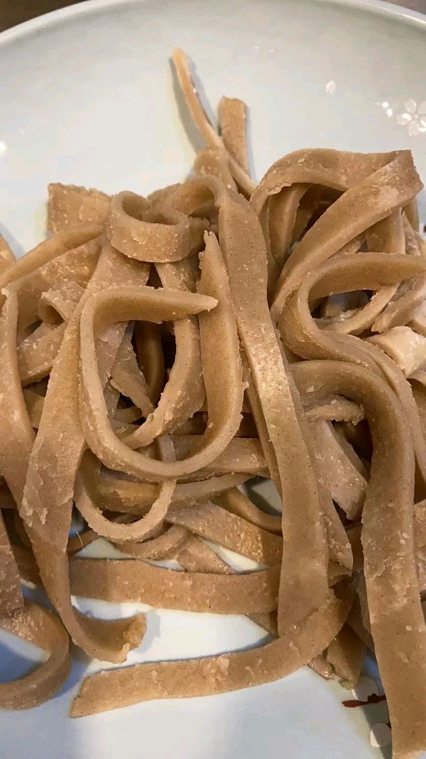 步骤6、将切好的莜面与青椒肉丝倒入锅中。