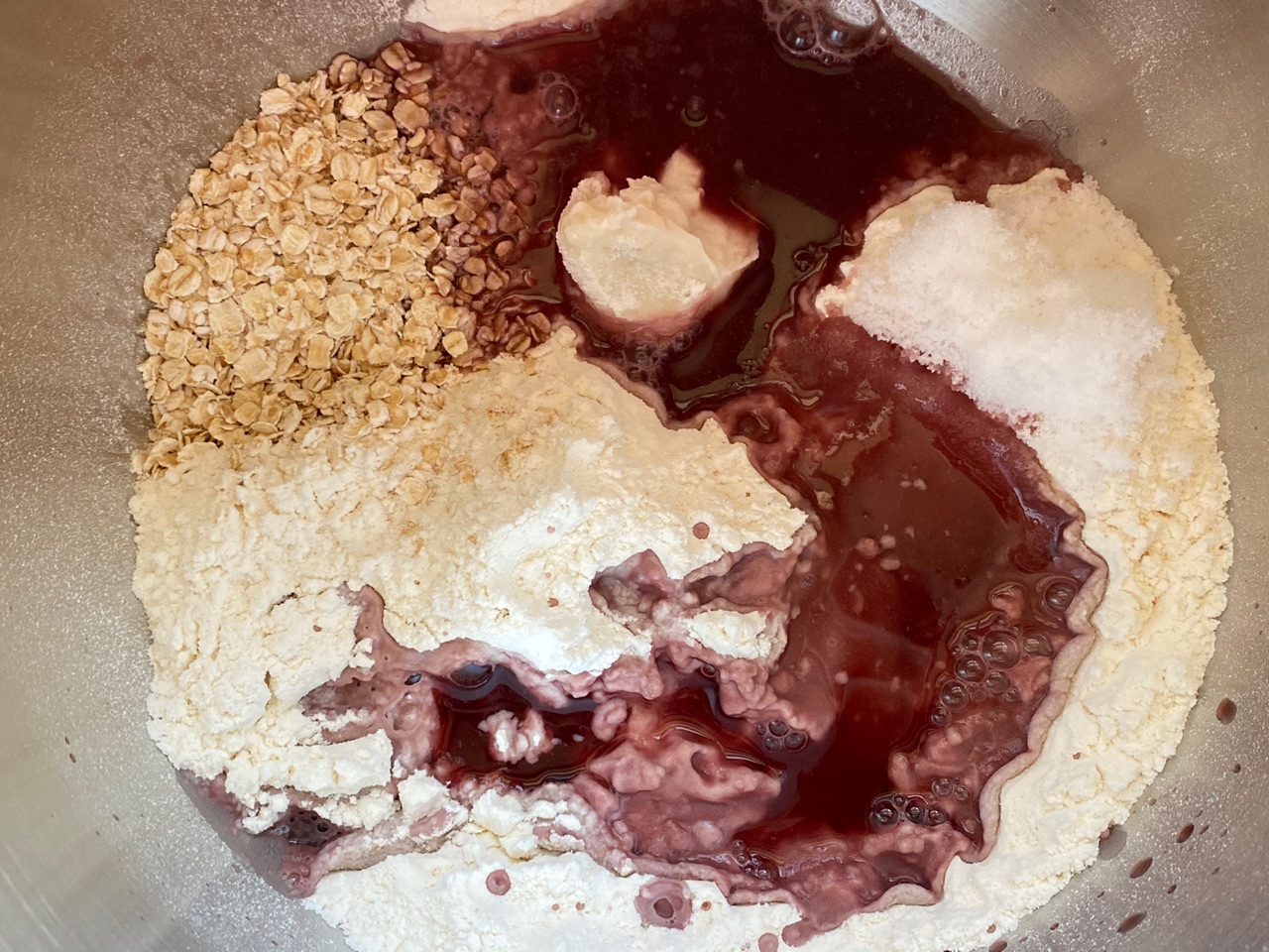 步骤1、首先把酵母粉撒在配料表的水中,让其自行分解5分钟,然后把高筋面粉、烫种、糖、麦片放进搅拌桶内,再把红酒和水倒进去