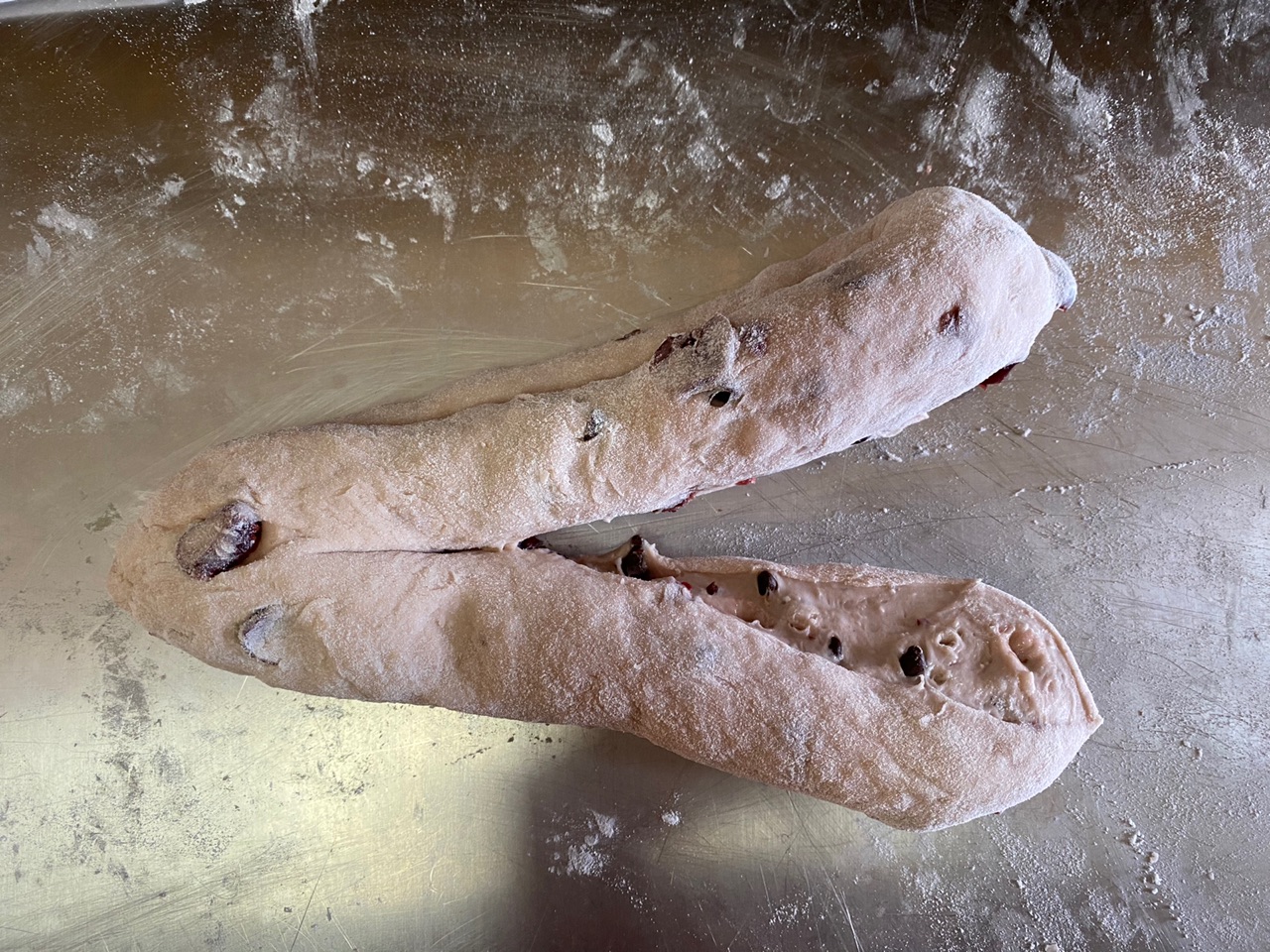 步骤10、从顶部向下卷起来底部收紧,搓成两头尖一些的橄榄形长条,收口朝内光滑面朝上,对折面团然后从对折处中间切开,面团另一端留2厘米不要切断