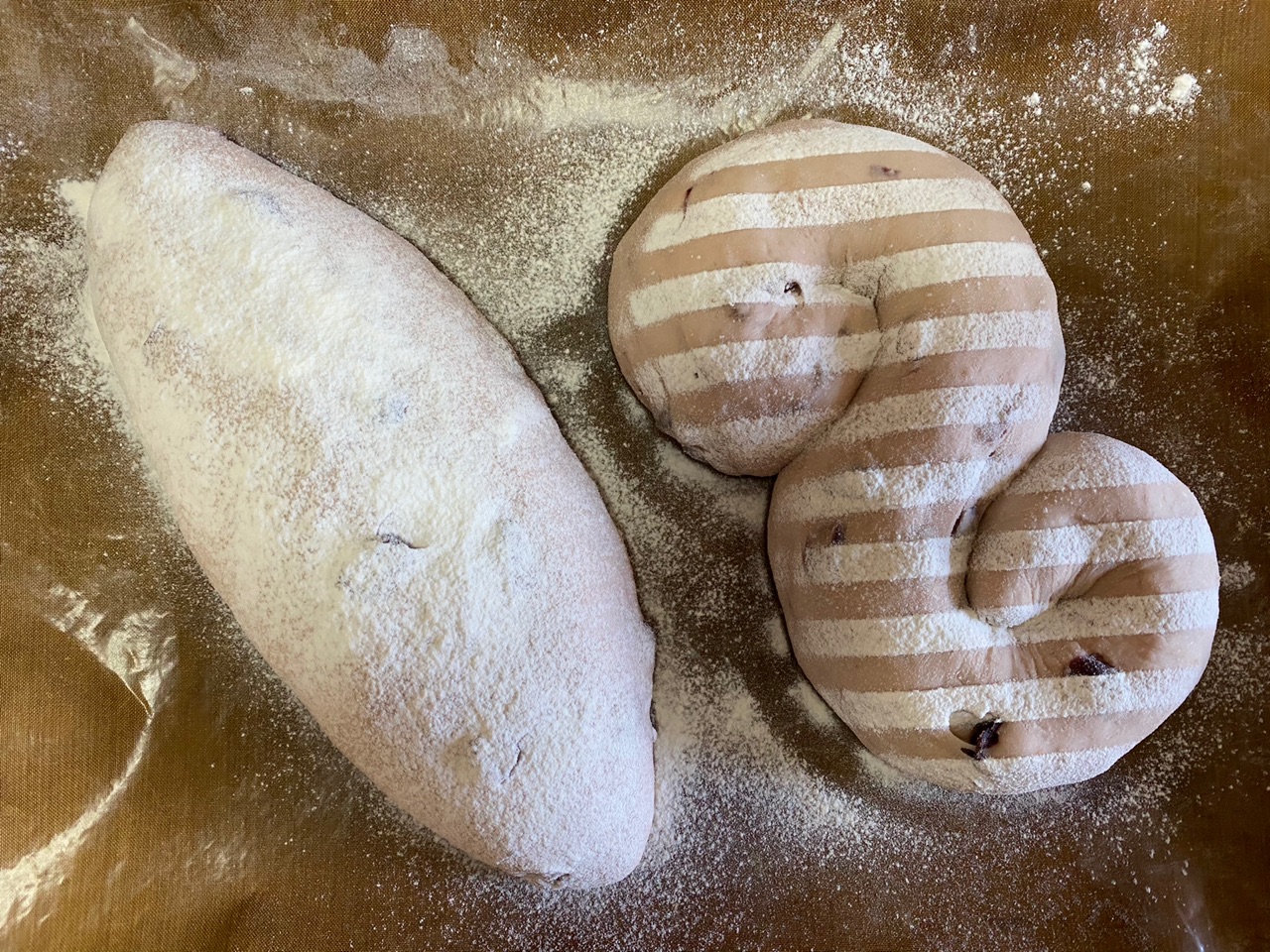 步骤12、再来说一下S造型的做法,之前添加巧克力豆,收紧整理成两头尖的橄榄形长条都跟大嘴唇操作一样,然后从两端分别向内反向卷起,卷成S形状;这个S造型可以把耐烤巧克力豆在添加蔓越莓时,一起添加进去,省去后面添加的过程。
