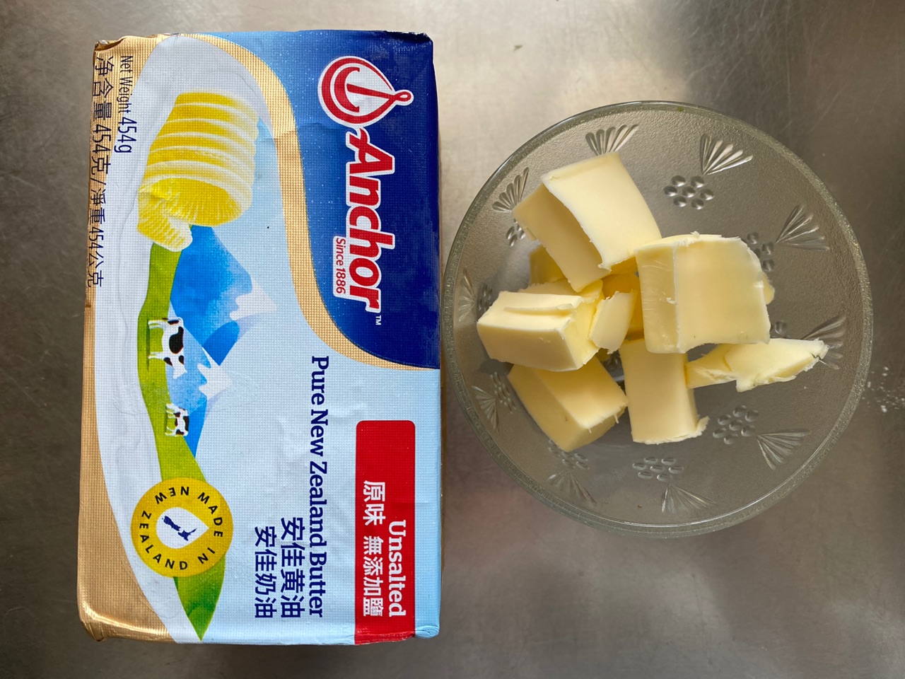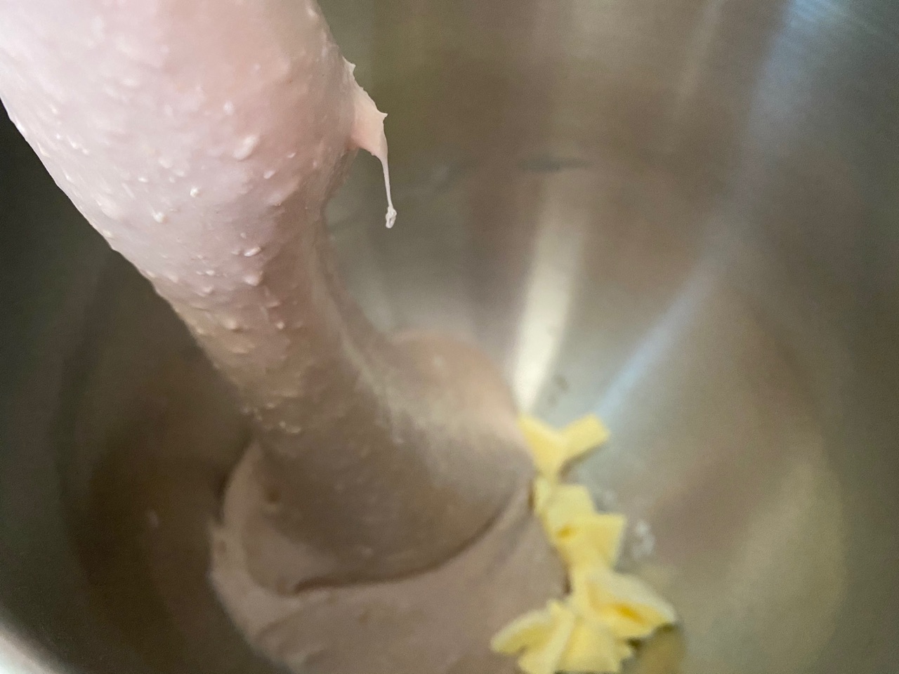 步骤3、开始低速搅拌面团。大约5-8分钟,当面团搅拌至比较细腻的的状态后,加入黄油和盐,继续低速搅拌3分钟,再快速搅拌2分钟