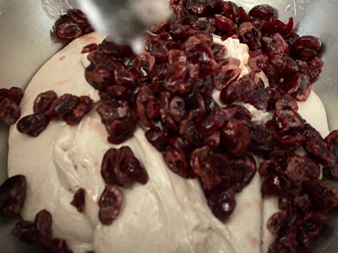 步骤5、这时把蔓越莓干添加进面团中,可以徒手把面团翻折几次,也可以用厨师机低速搅拌1分钟