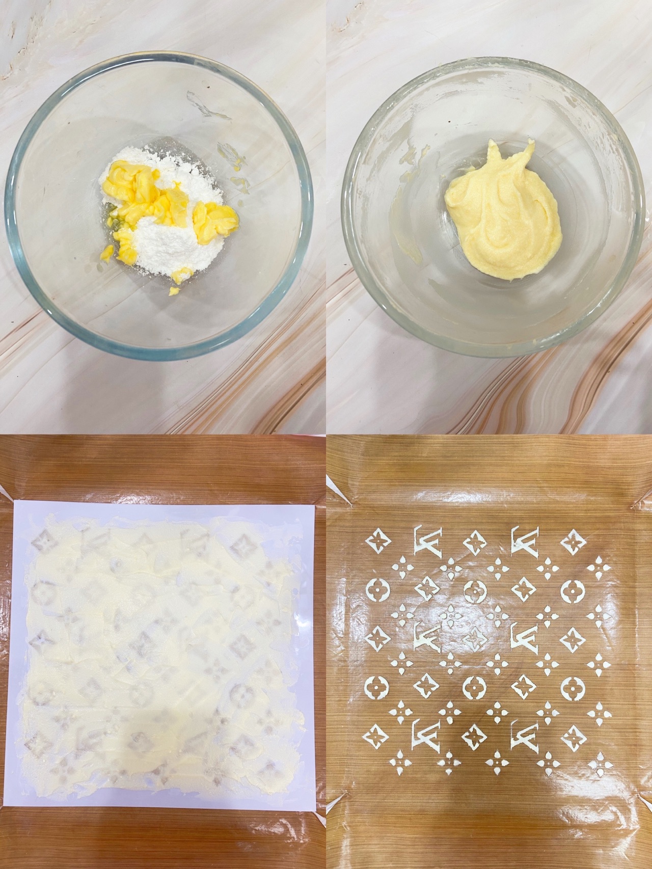 步骤1、制作印花糊,黄油软化后加入材料翻拌均匀,油布上摆上印花模具,用刮板将黄油糊均匀涂抹在油布,揭开硬花模具,将油布放入烤盘,冰箱冷冻室冷冻;