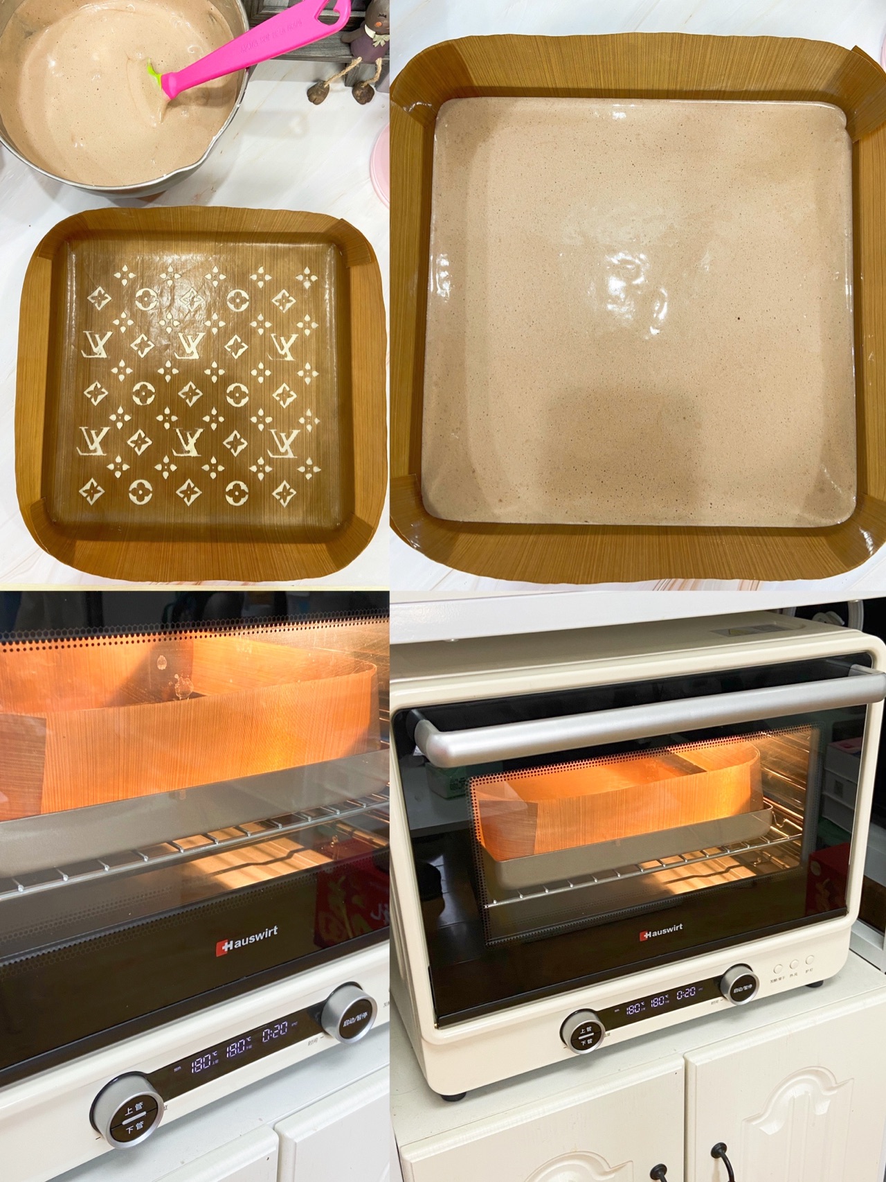 步骤4、取出冷冻好的烤盘,将蛋糊倒入烤盘,用刮刀抹平,模具震几下震出大气泡;烤箱提前预热至180度,将蛋糕糊放入烤箱中层,烤18分钟;