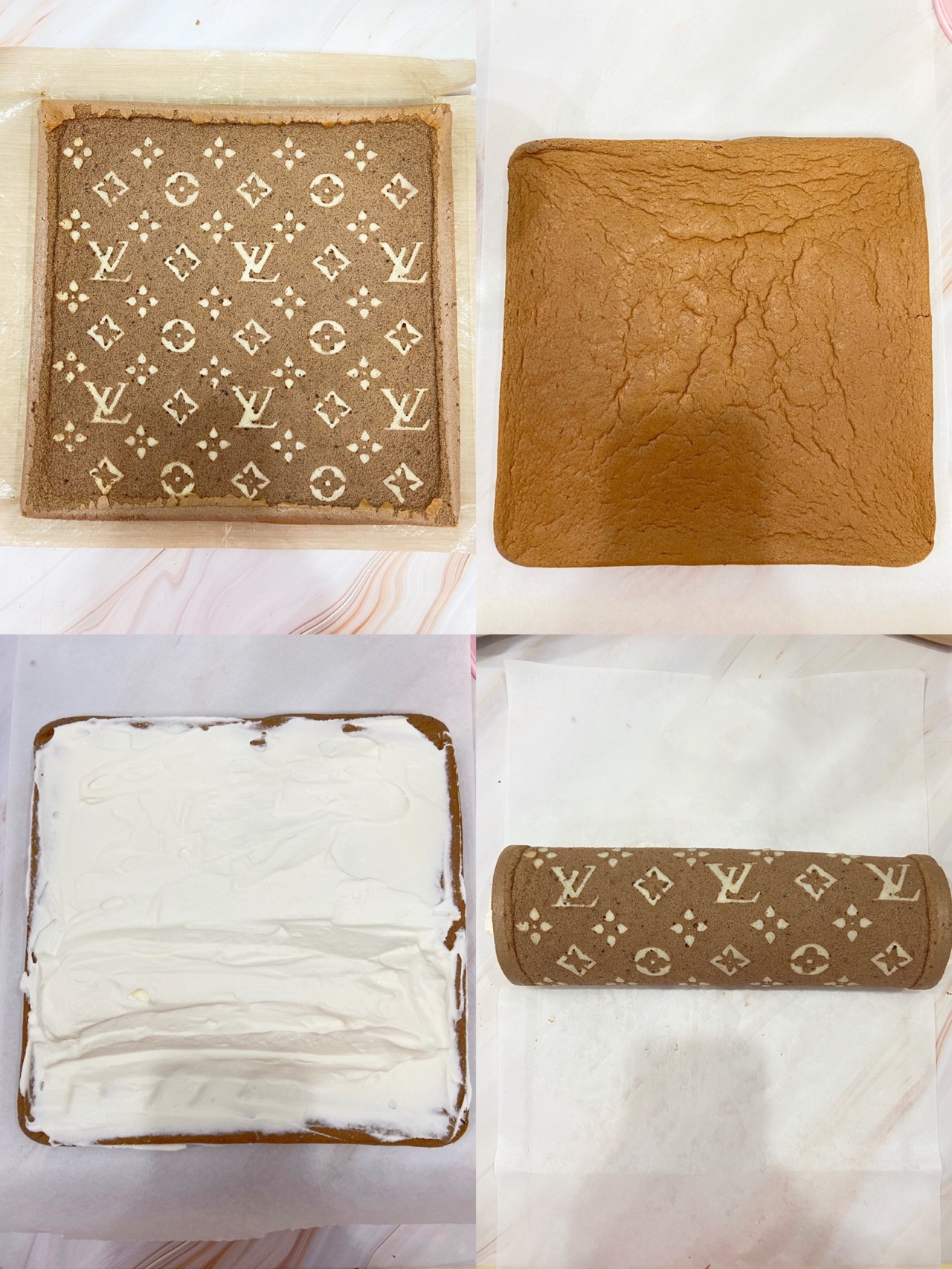 辅料:糖粉15g、低粉15g、蛋白15g、蛋糕卷:、鸡蛋4个、玉米油40g、可可粉10g、牛奶70g、面粉50g、白砂糖45g(其中5g放蛋黄里)、奶油馅:、淡奶油200g、细砂糖20g
