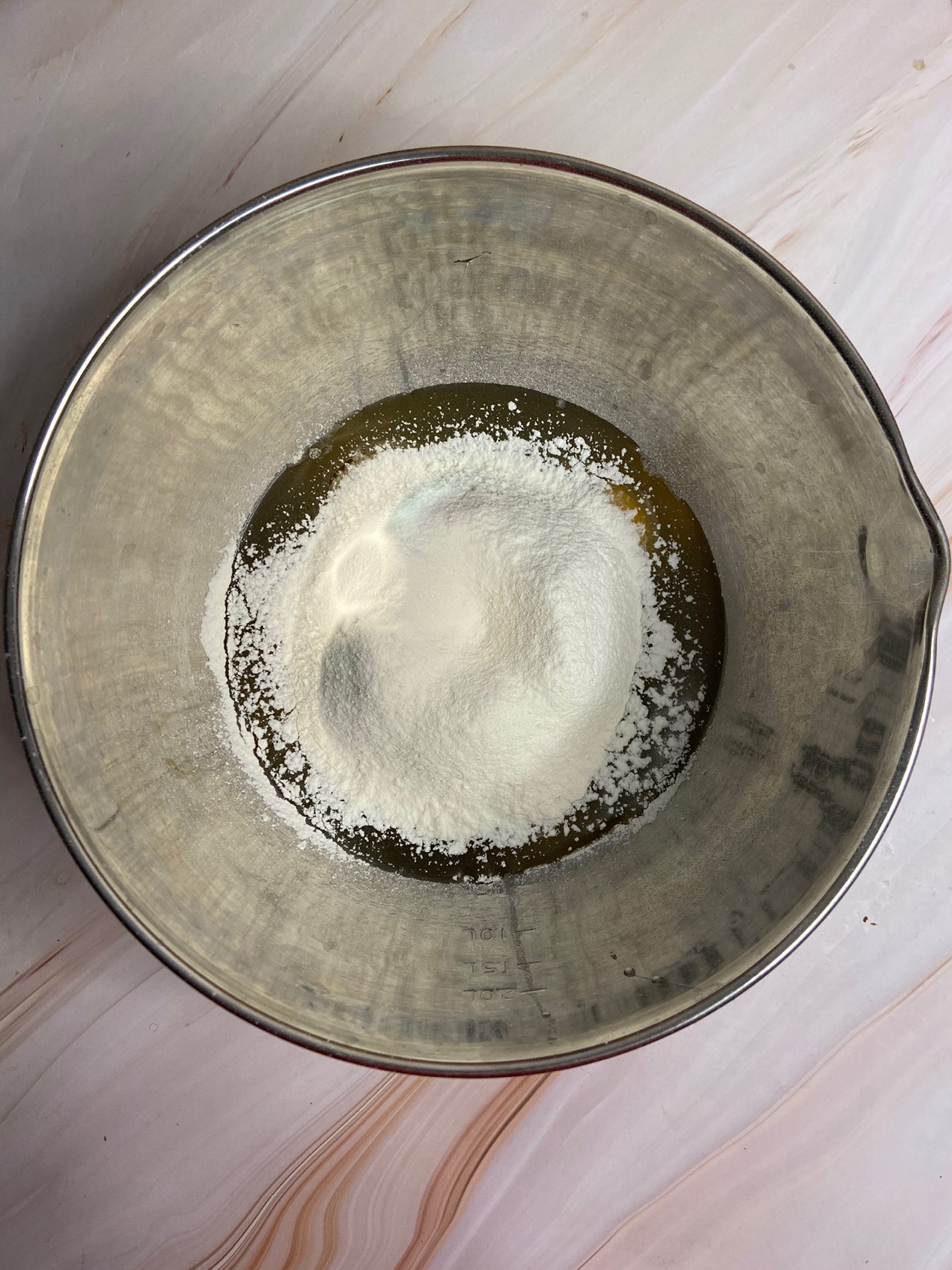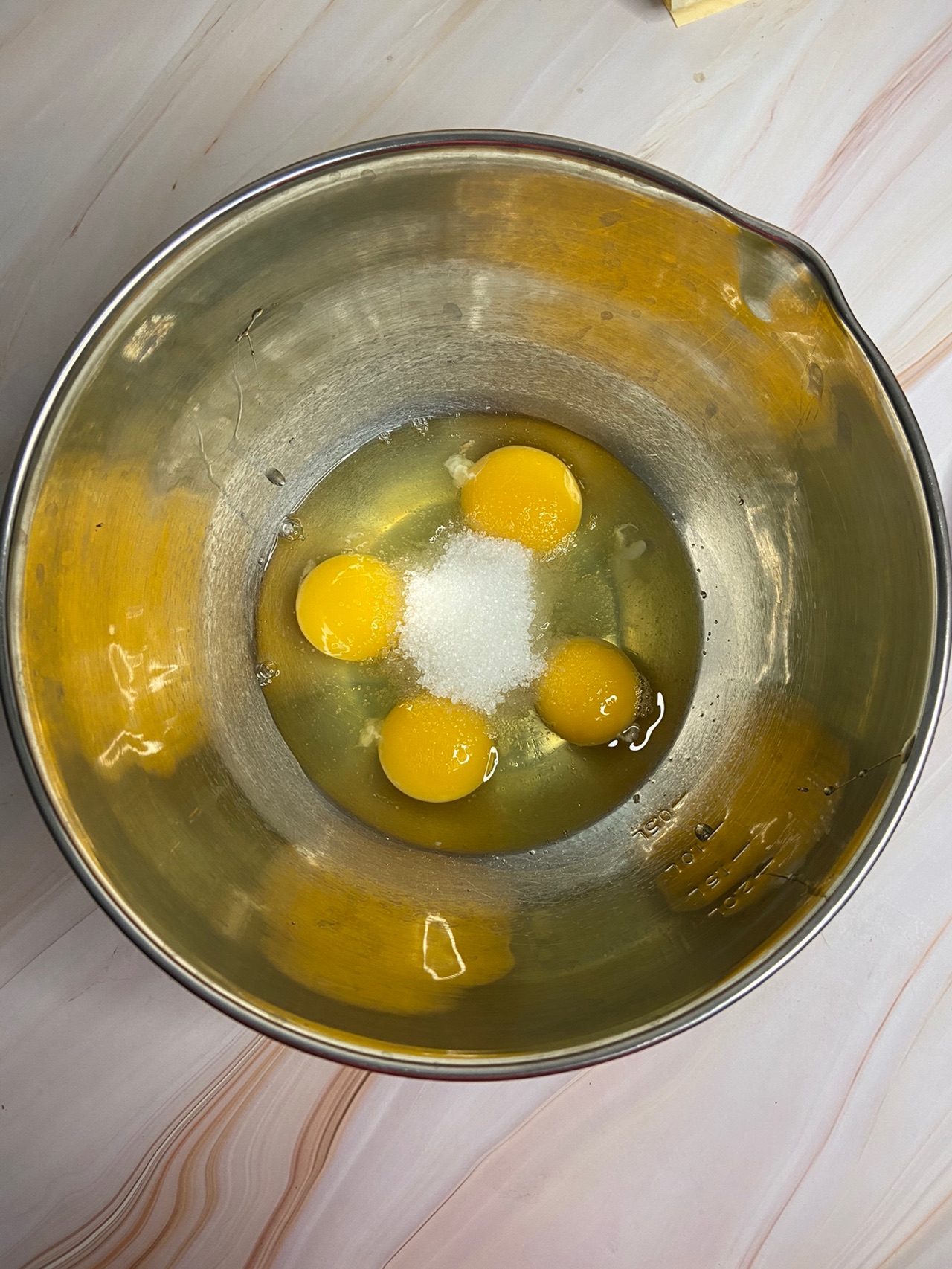 步骤2、鸡蛋、白糖、玉米油混合