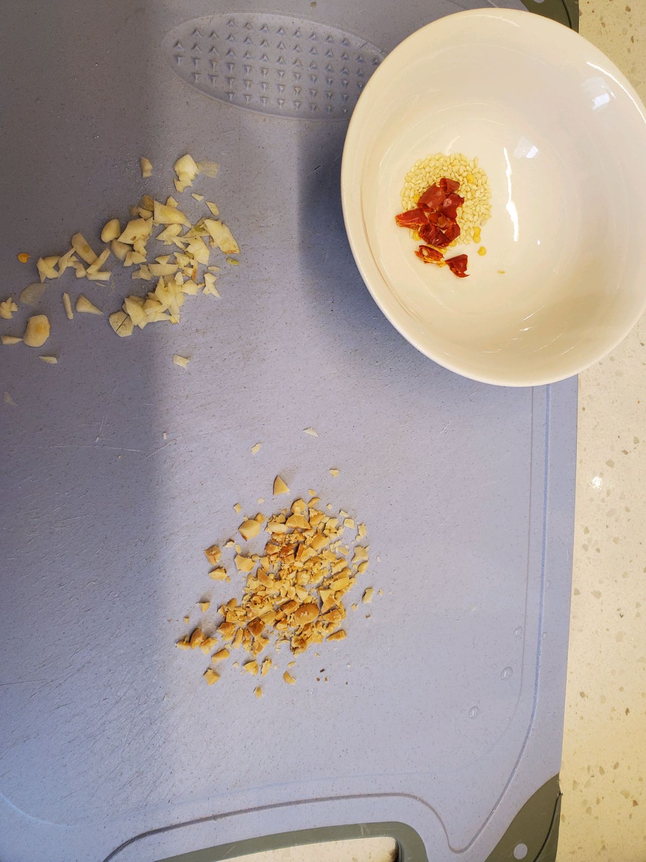 步骤2、准备好一会油泼用的增香配料,蒜泥、花生碎、白芝麻、干辣椒