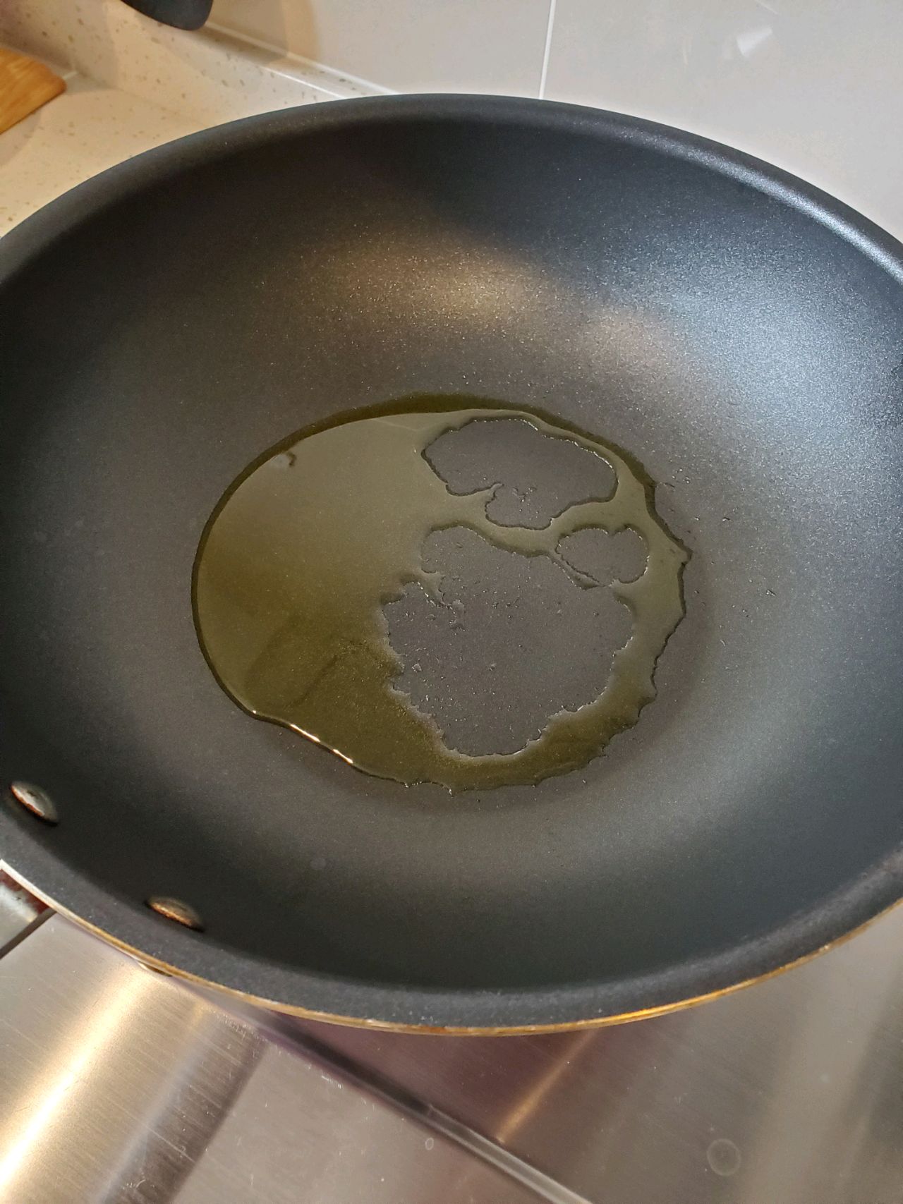 步骤5、然后热锅,加入两勺橄榄油,直到开始起泡或发出渍渍渍的声响时,用锅铲将热油取出(一定小心高温喷溅,注意安全⊙∀⊙)