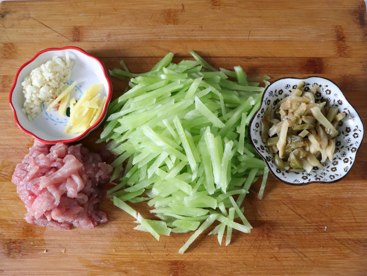 步骤2、大蒜切末,生姜切丝,莴笋,猪肉和榨菜切丝,榨菜过水去掉多余的盐分