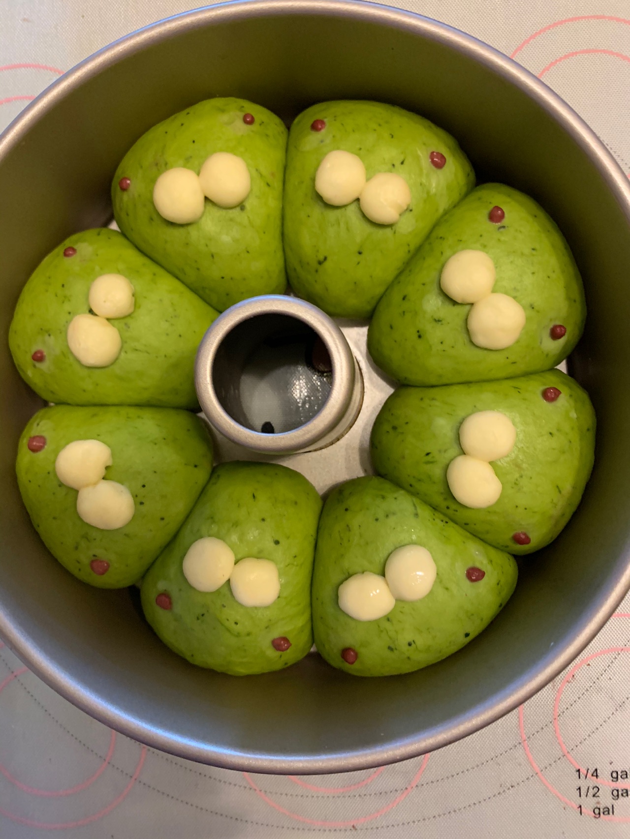 抹茶粉建议用少许水活成糊状再与白面团揉匀。我这个就是直接揉的抹茶粉明显不均匀。