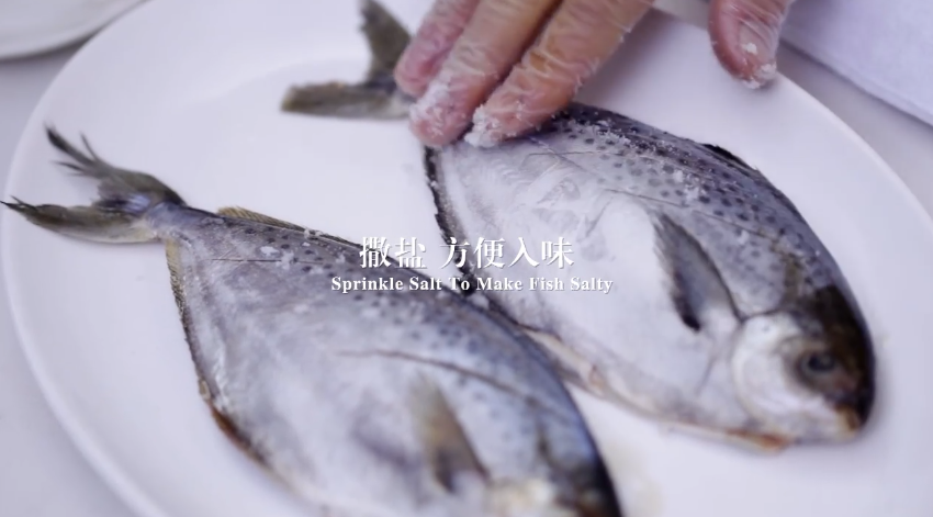 步骤3、将两条鱼,双面抹盐,放入盘中。