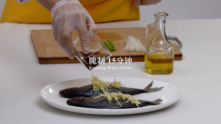 步骤4、将切好的姜丝铺在鱼身上,倒一点油在鱼上,并各浇1勺料酒腌制15分钟。