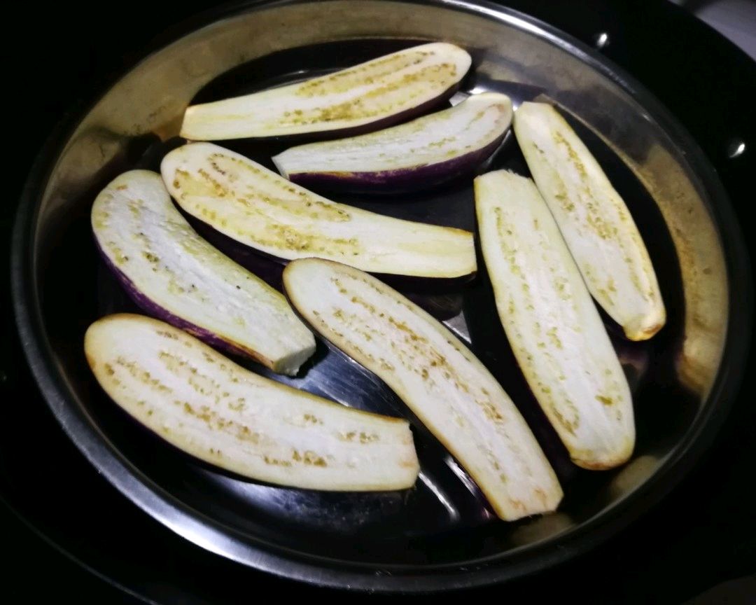 步骤3、茄子对半切开,放锅里蒸15分钟。