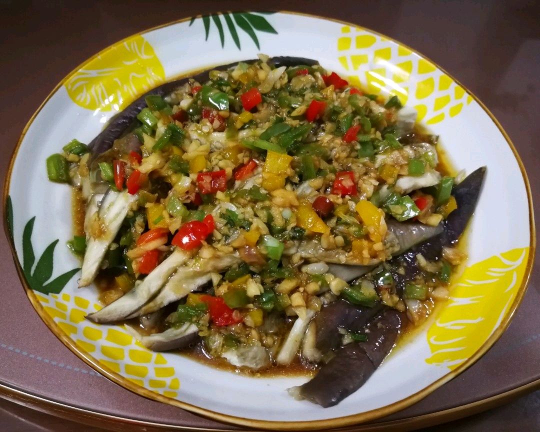 步骤5、热锅冷油,将待用的配料:青红椒葱蒜放入炸香,加入盐+生抽+蚝油+胡椒粉+香油+微清水。(此步骤可把蒜末铺茄子上,热油淋入呛香即可)