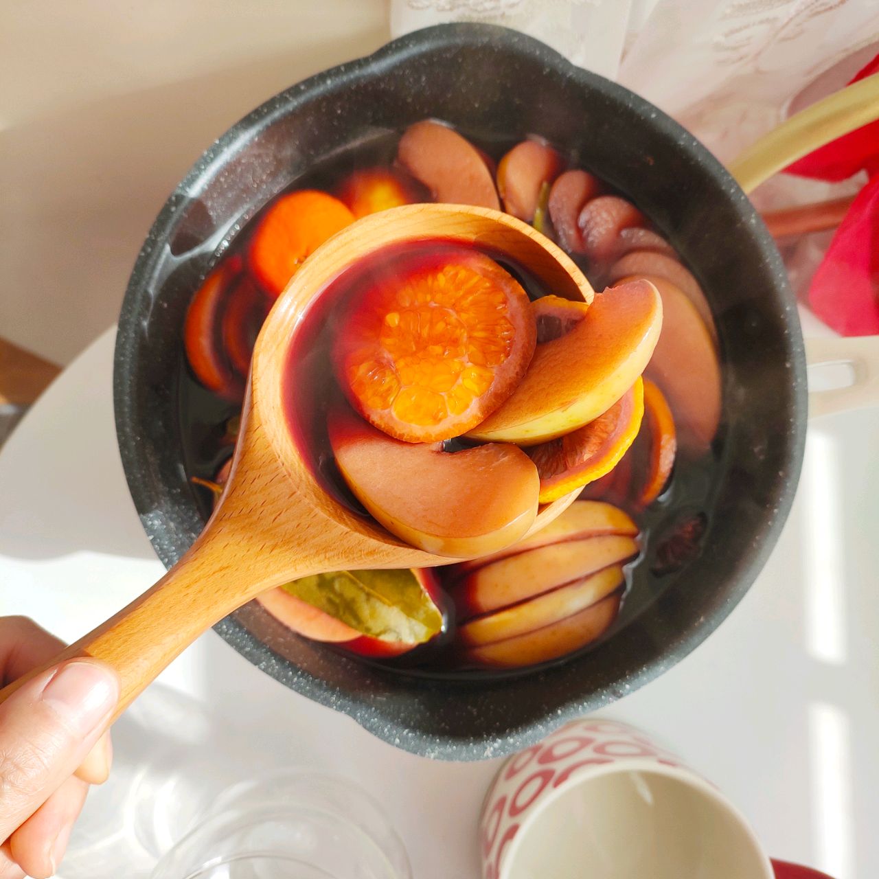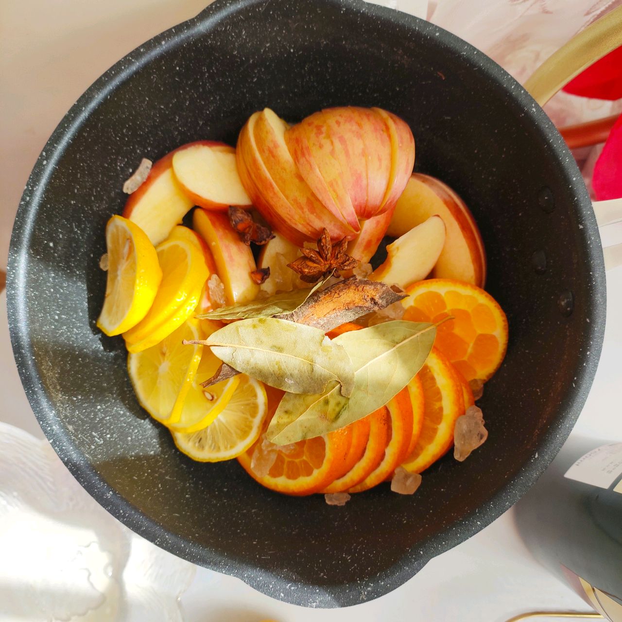 辅料:柠檬1个、八角2个、香叶3片、肉桂1根、冰糖适量、红酒500ml