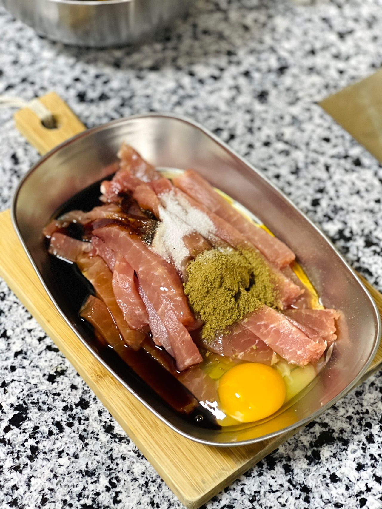 步骤2、加一个鸡蛋,适量的盐,花椒粉,料酒,生抽,老抽