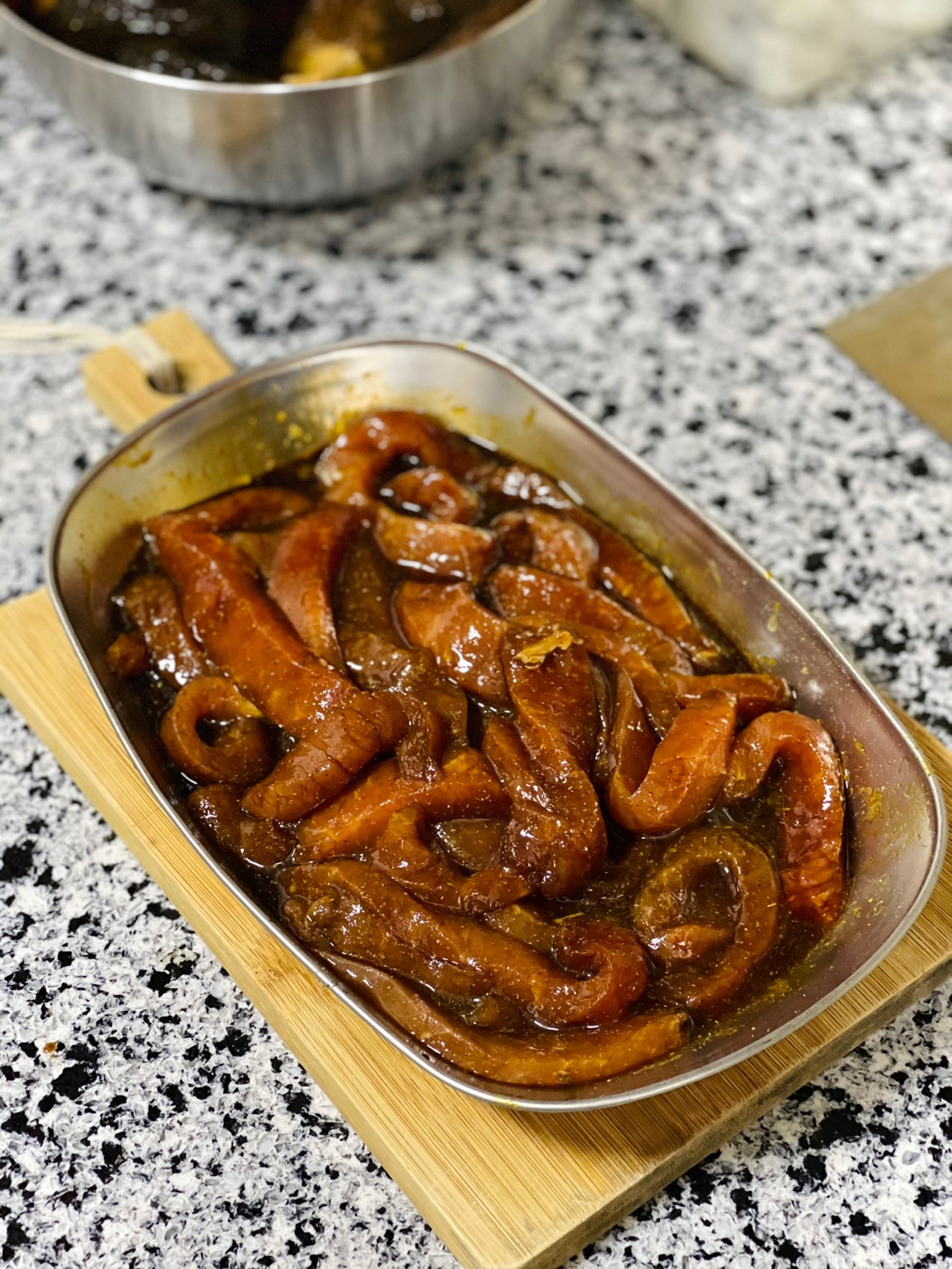 步骤1、里脊肉切条或者是切片,如果你喜欢吃五花肉,也可以用去皮的五花肉切片