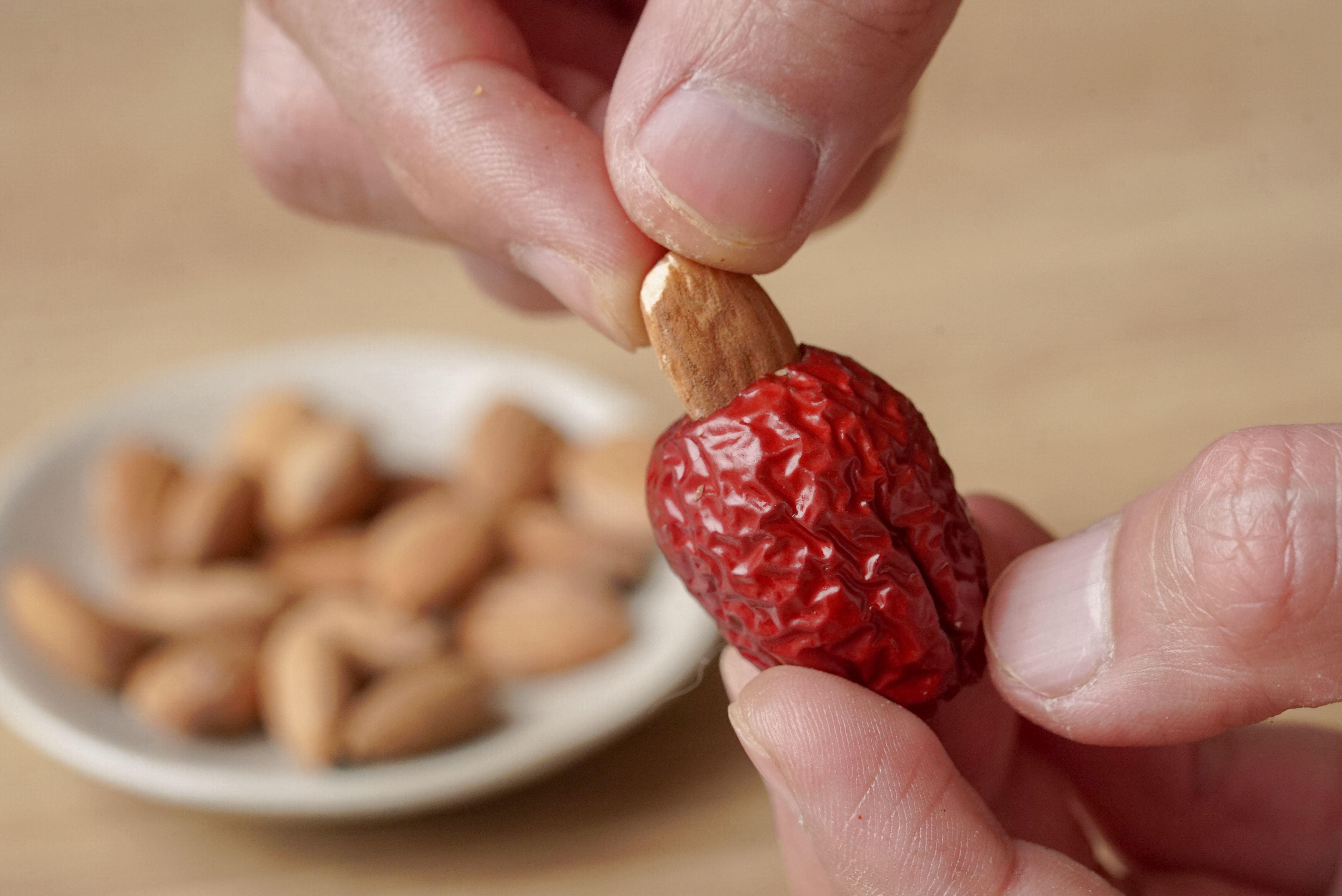 步骤1、1、准备15颗红枣洗净,用粗一些的吸管把中间的核去掉,并放入巴旦木备用。