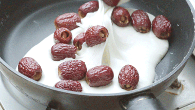 步骤4、4、放入红枣炒匀,再一颗一颗拿出搓圆。