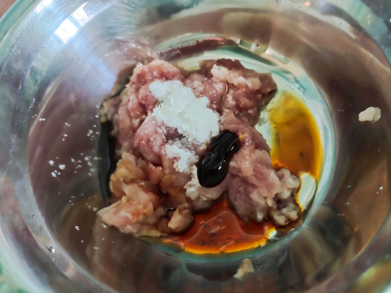 步骤2、瘦肉切碎,放入盐,生抽,耗油,生粉和料酒各一小勺搅拌均匀腌制。