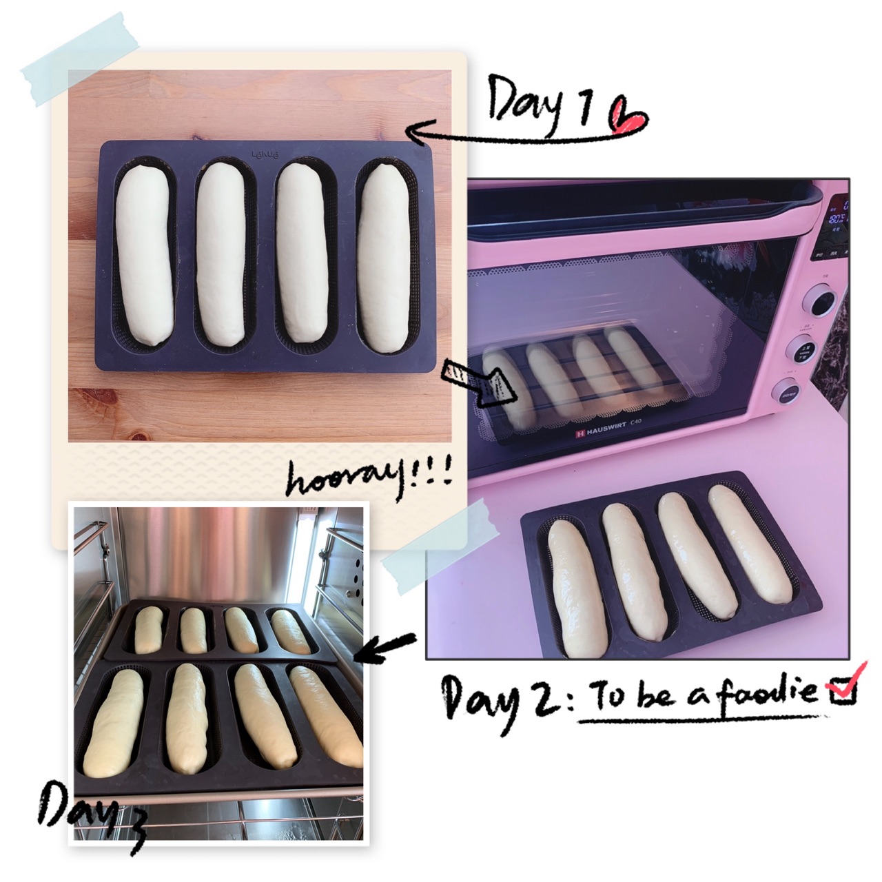 步骤1、1.将面团材料里除黄油、盐以外的其他材料放入揉面桶内,揉面10分钟,加入盐、黄油,继续揉面揉至完全阶段。2.放温暖处发酵至两倍大,温度28度,湿度80%左右。3.取出发好酵的面团,按压排气,分割成6等份,滚圆后盖上保鲜膜松弛15分钟。4.取一个面团擀成椭圆形,翻面,从上到下卷起来,捏紧收口处,放在烤盘上。