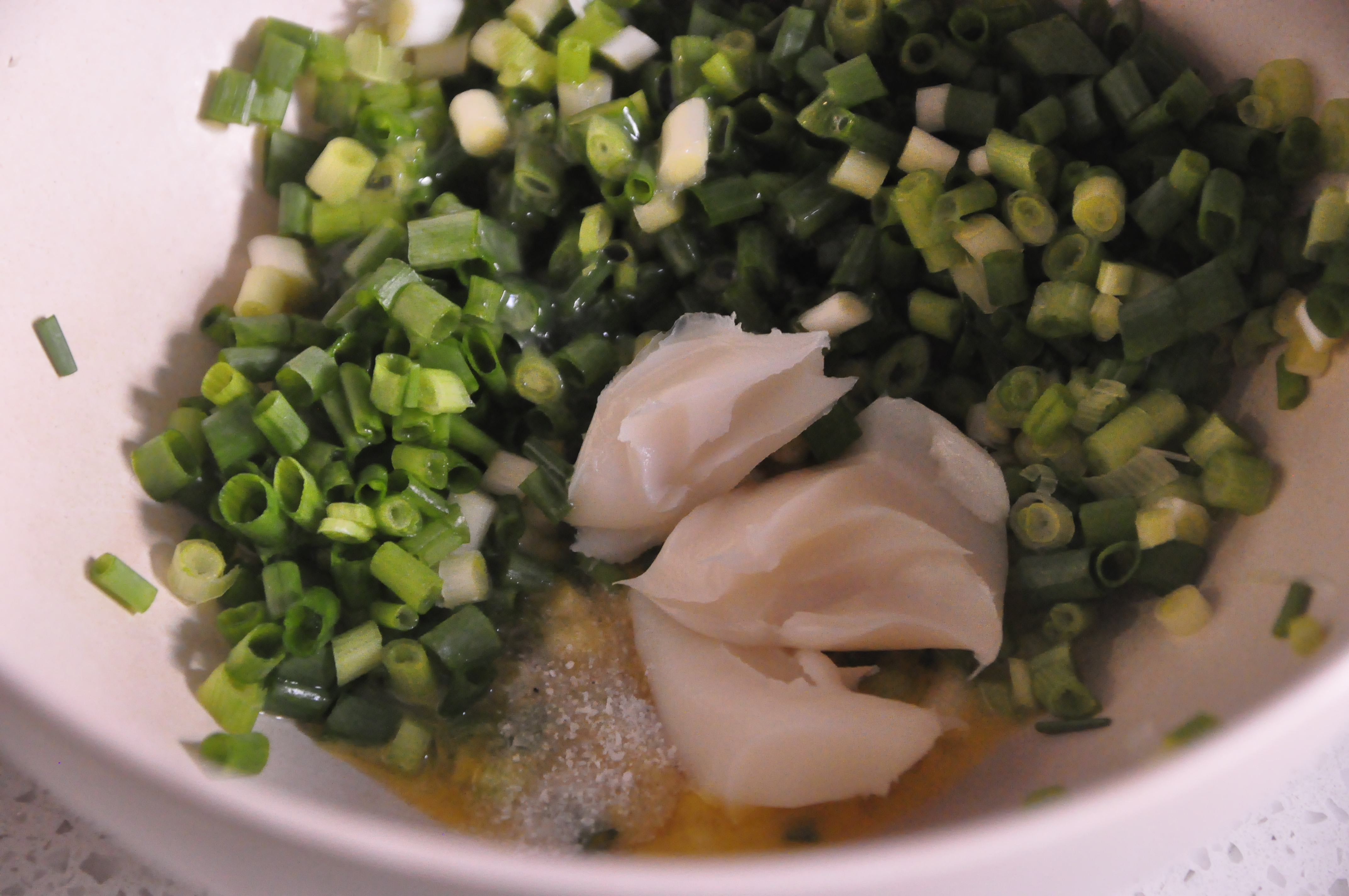 步骤10、二次发酵快结束的时候开始调香葱,把所有材料混合在一起,混匀即可,没有猪油使用黄油也可以。