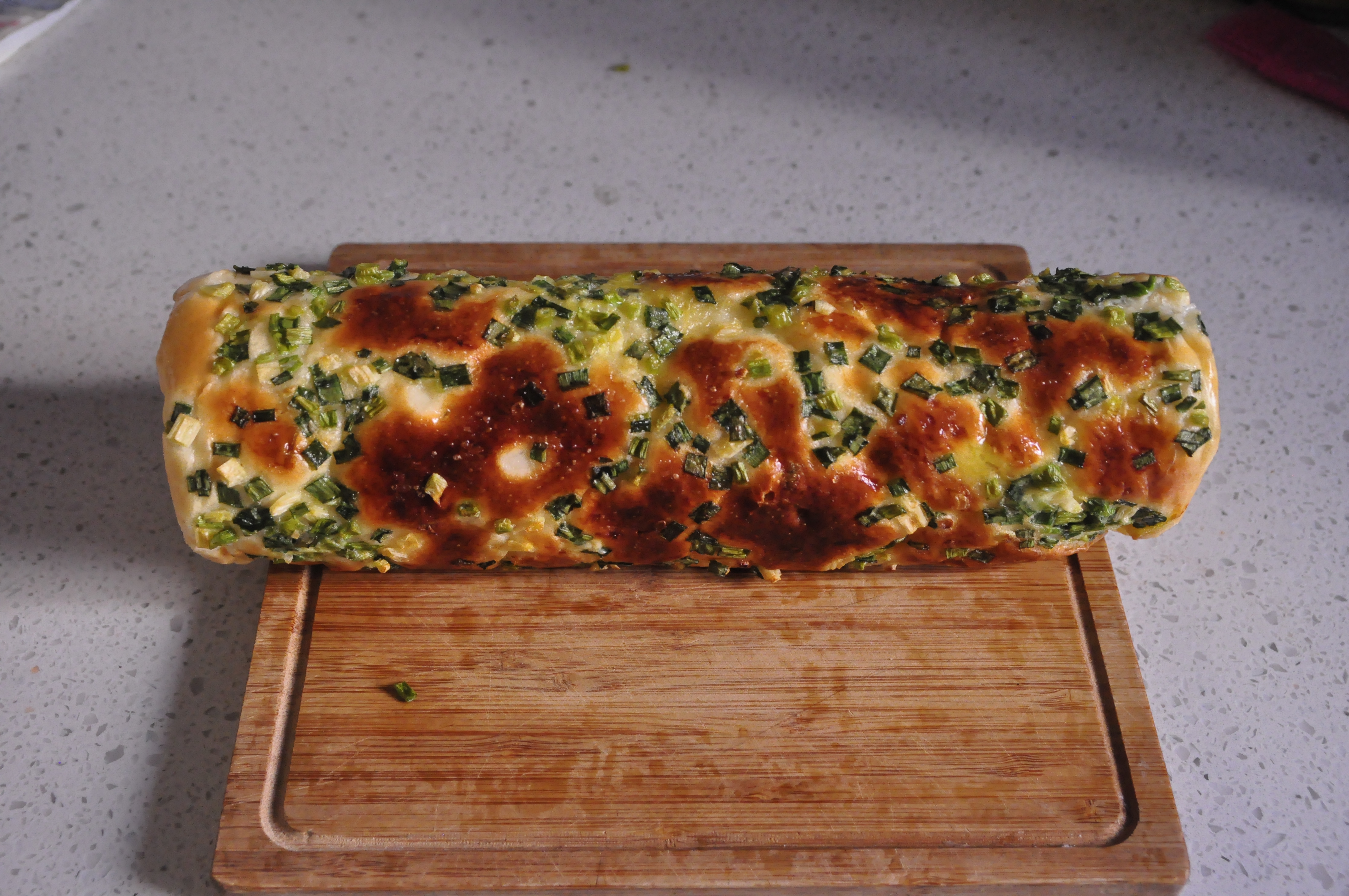 步骤12、把香葱平铺在面团表面