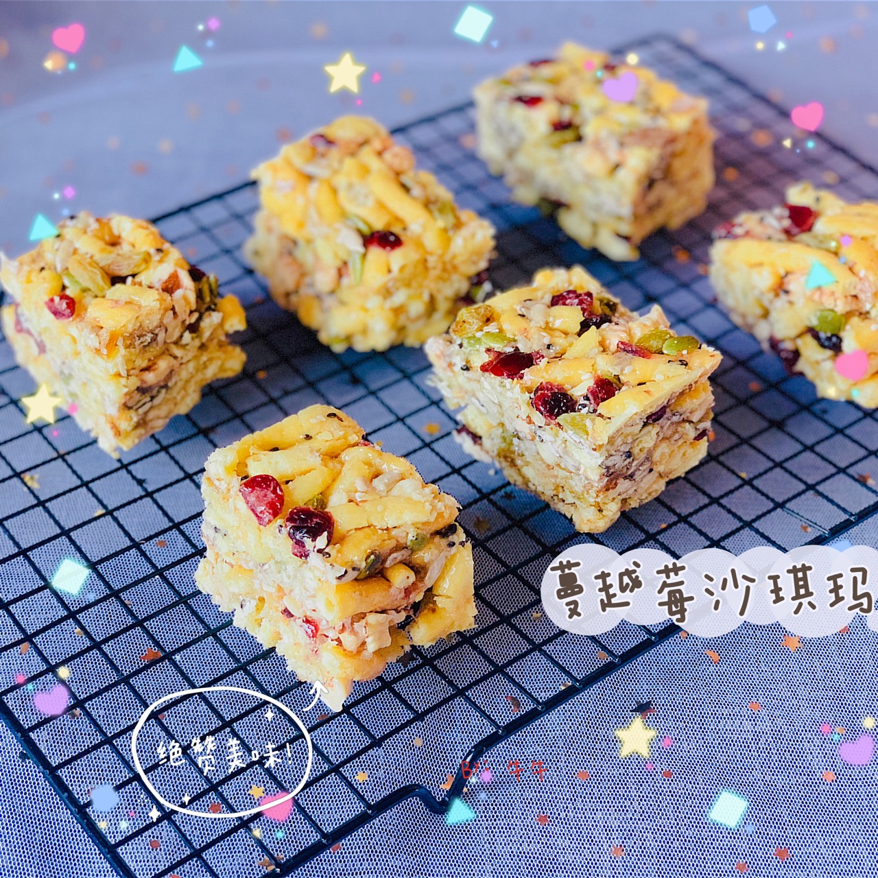 步骤9、倒入面条里面,并放入蔓越莓和葡萄干搅拌均匀,并放入磨具压实