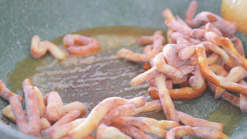 步骤11、糖浆开了,差不多115度就关火。关火后立刻把面条倒入。