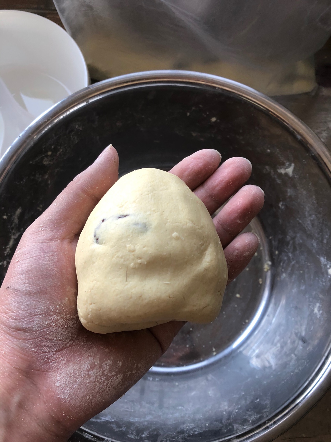 步骤5、4,这时候需要召唤你可爱的媳妇!让她帮你慢慢加水,一定要少量多次,把面搅拌成这种絮絮状,并且能捏成型就可以!(注意⚠️,千万不要放多水,如果是第一次做的话,宁少勿多!)
