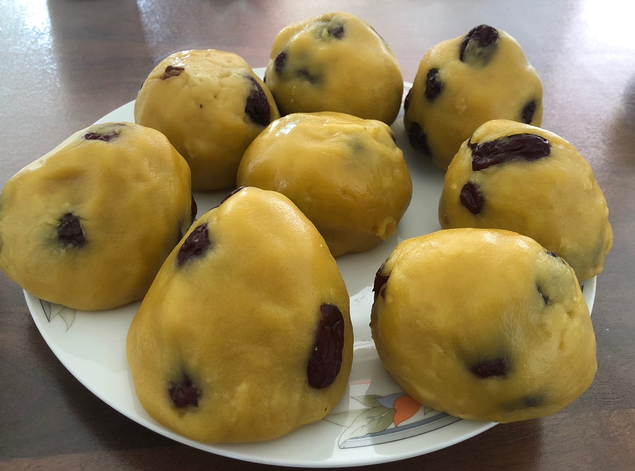步骤4、3,把烫好的枣,放入黄米面中。(红枣和面的比例大约是1:3,喜欢枣的可以多放一点!但是提醒大家呦:什么事都要有个度!如果枣放的太多,那就会很变的很苦!所以,你懂得……)