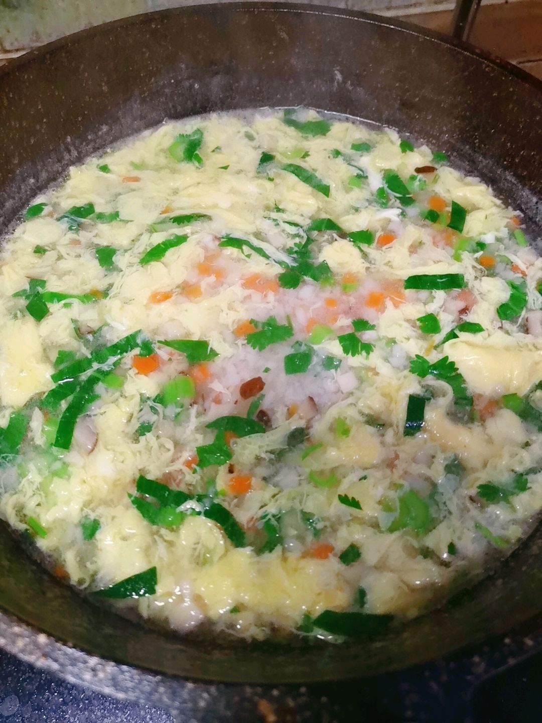 辅料:胡萝卜1/3根、小油菜2个、鸡蛋1个、清水600毫升、葱、味精、盐、白胡椒粉