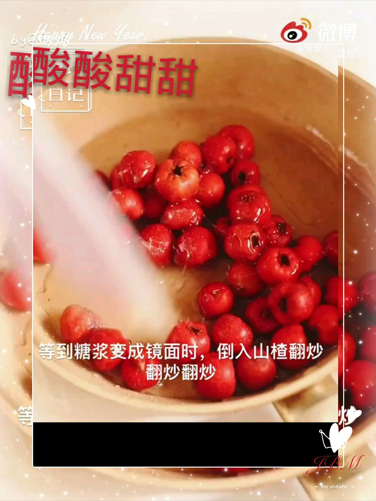 步骤4、等2分钟左右,看糖浆的泡泡消失,变成镜面了就可以倒入山楂不断翻炒,直到糖浆变白全部包裹住山楂就可以了。