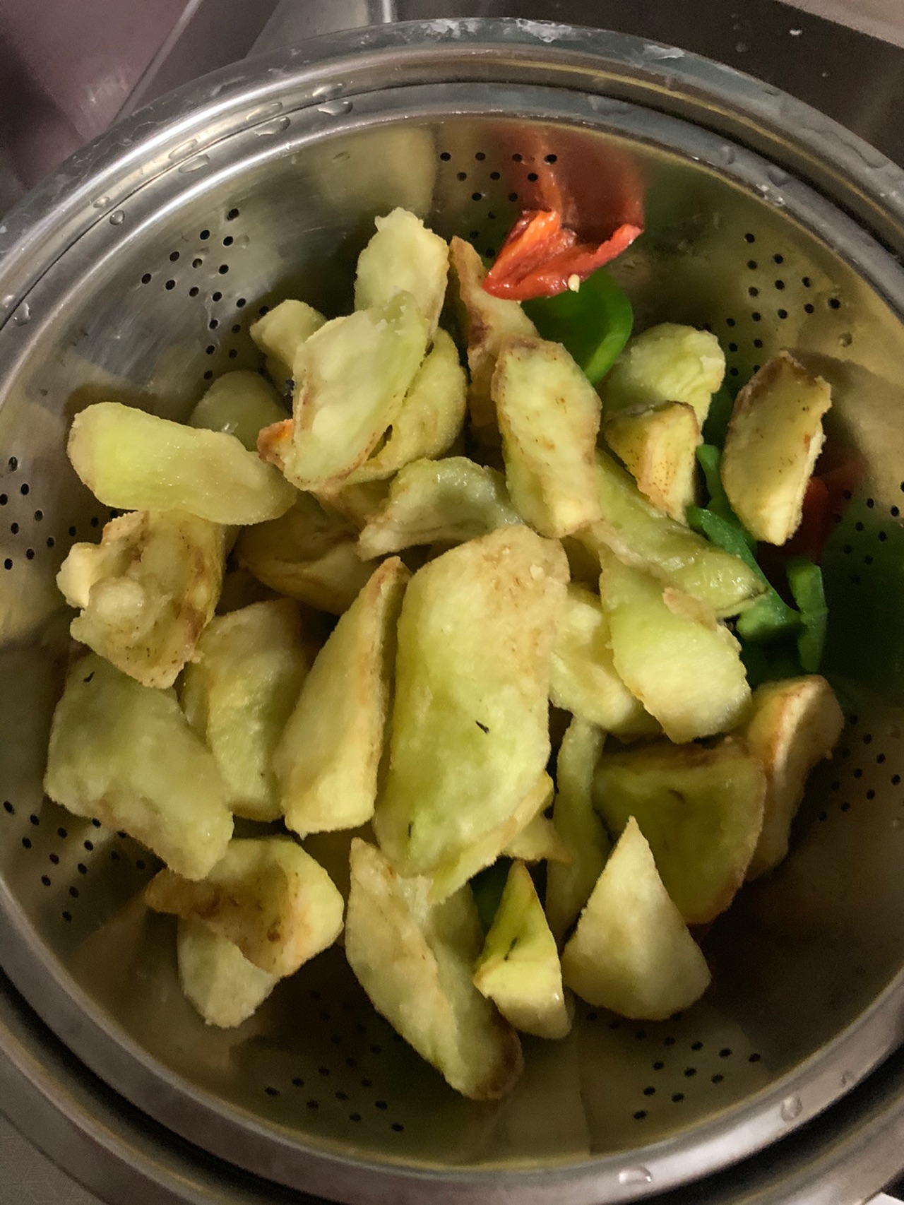 步骤2、茄子拍淀粉炸俩次,把青红椒过一下油