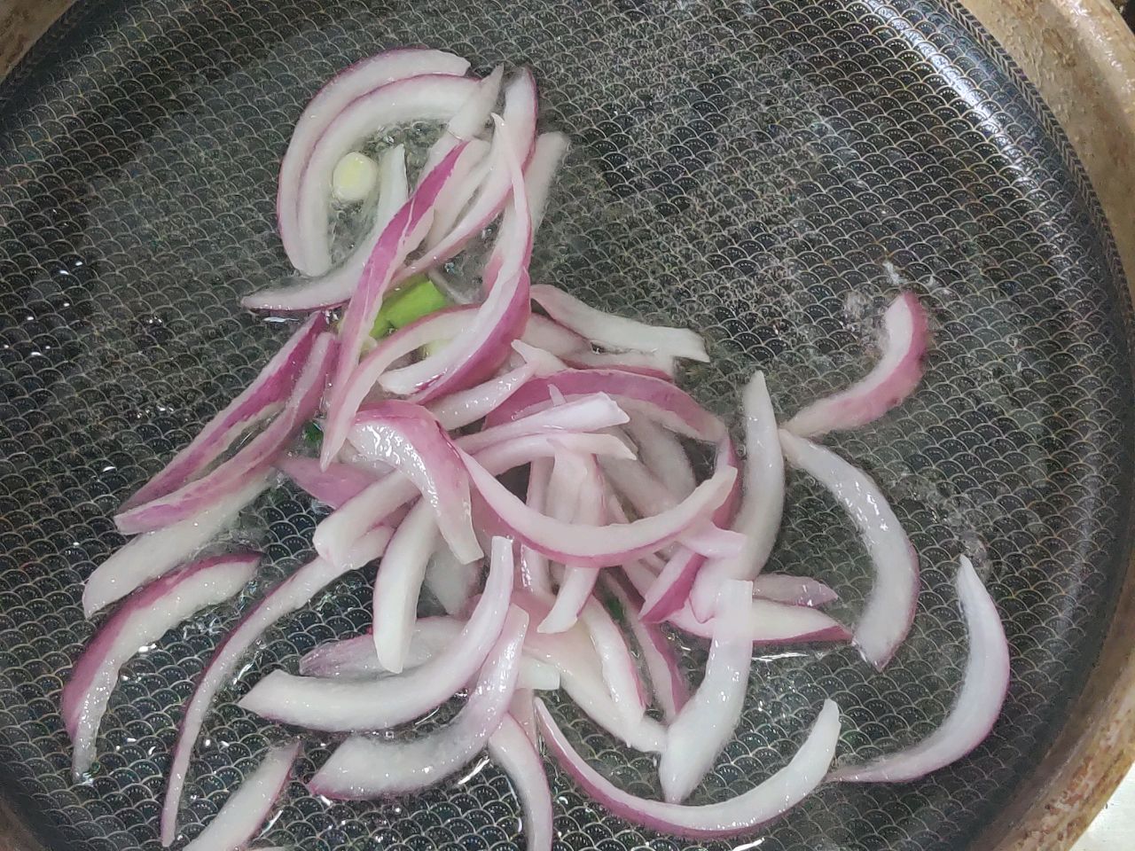 步骤6、热锅倒一点油,将切好的洋葱段放入,这一步可以用小火慢慢将洋葱炒香