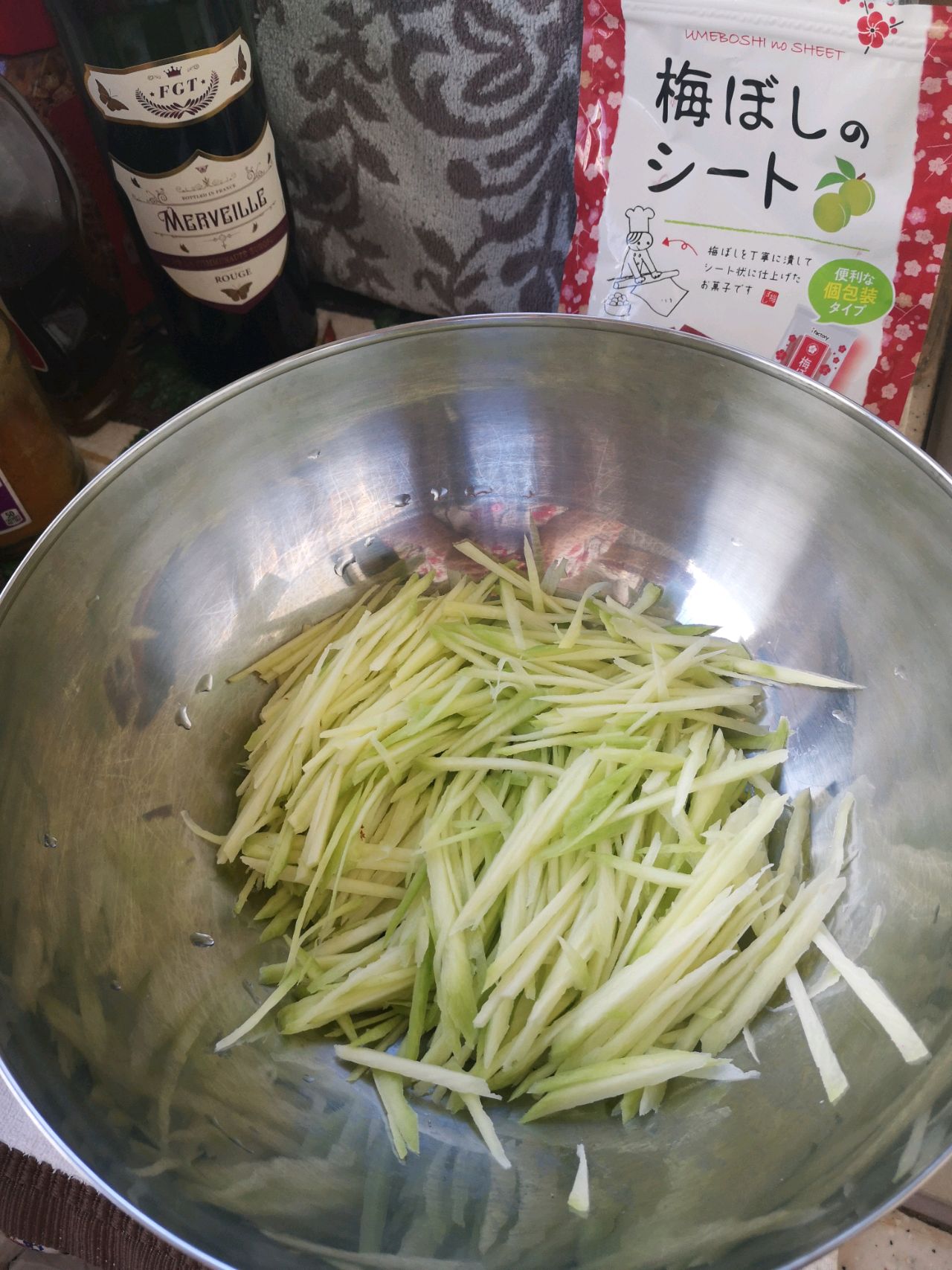 步骤3、只能改菜了凉拌吧红萝卜切丝青椒切丝盐渍话梅切丝(切出来成粒了)日本话梅片切丝生芒果切丝(考验我的刀功)…