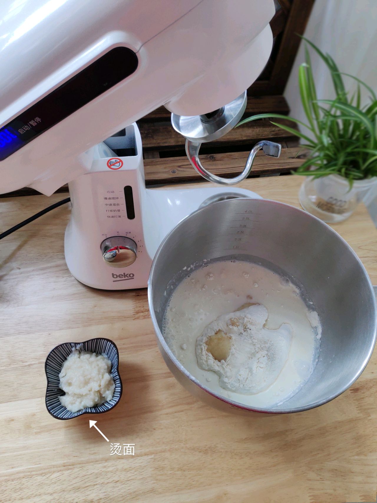 步骤3、厨师机的搅拌锅里加入烫面、加入高筋面粉500克、酵母5克、白砂糖40克、蜂蜜20克,最后是牛奶320克,牛奶可以不用一次性加完,先剩一点,每个面粉的吸水量不一样,低速打成团,用手捏一下有一点硬,然后这个时候可以再加一点牛奶,开了厨师机继续高速将面团打至厚厚的膜。