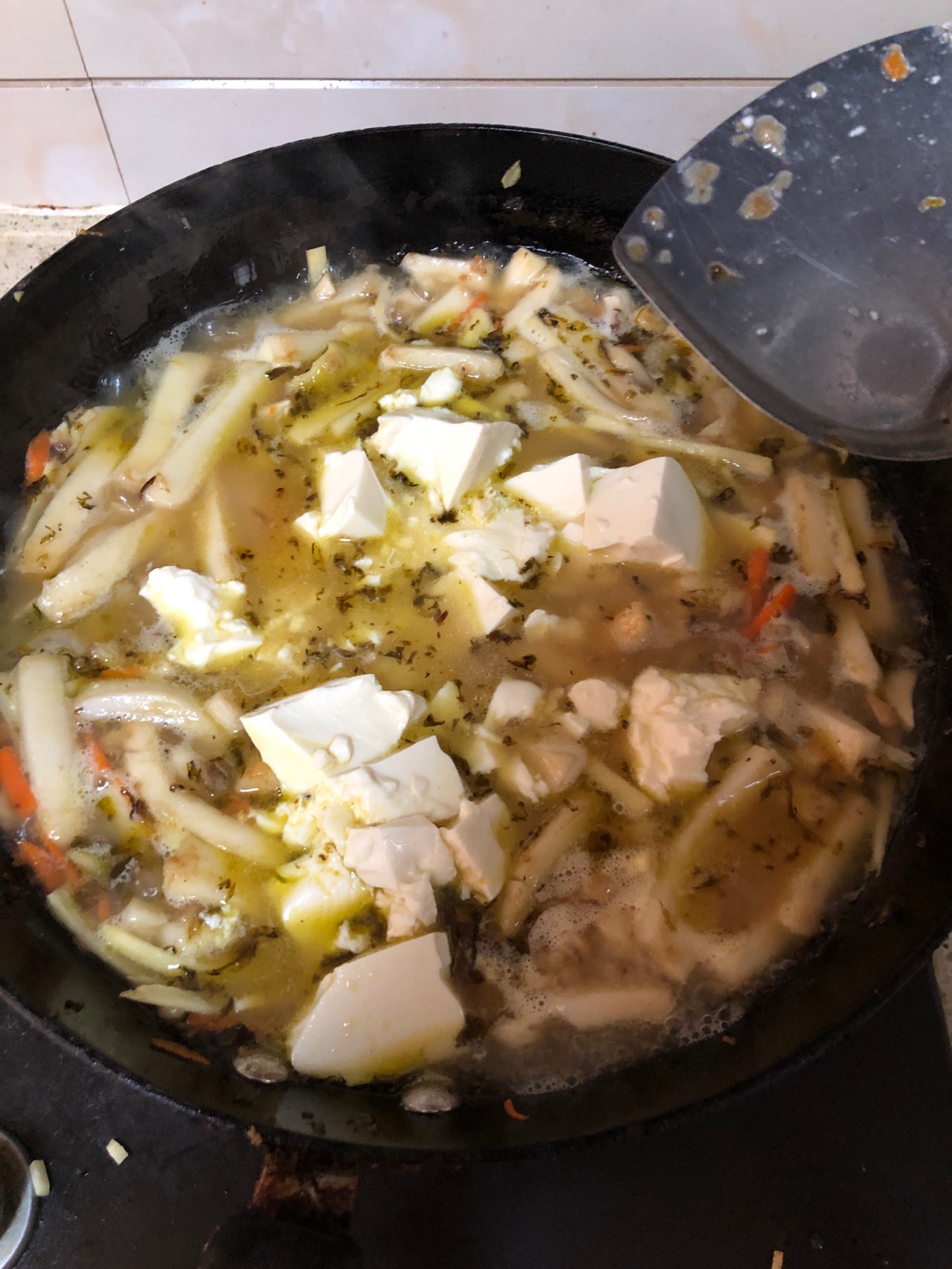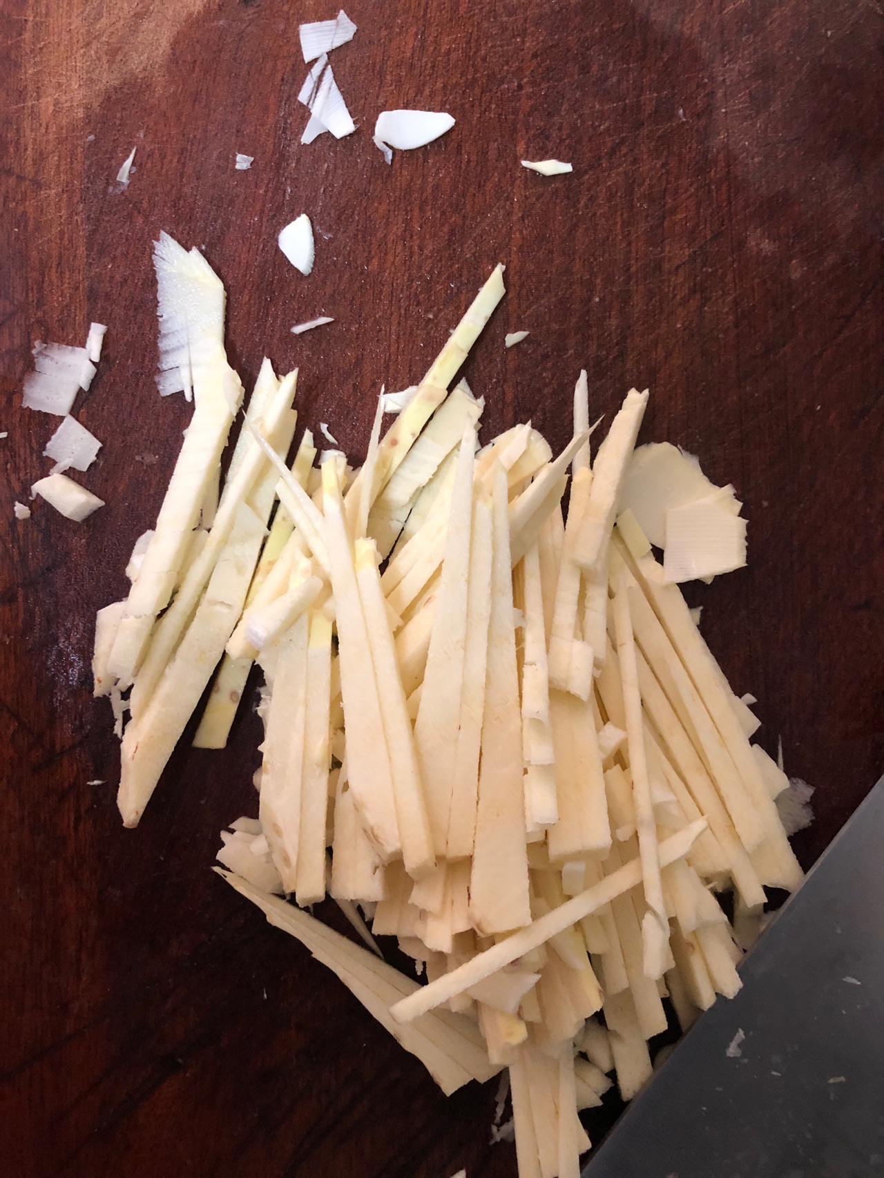 步骤6、把肉炒熟,加入笋翻炒片刻后,加入香菇、胡萝卜、雪菜,炒到断生后盛出。