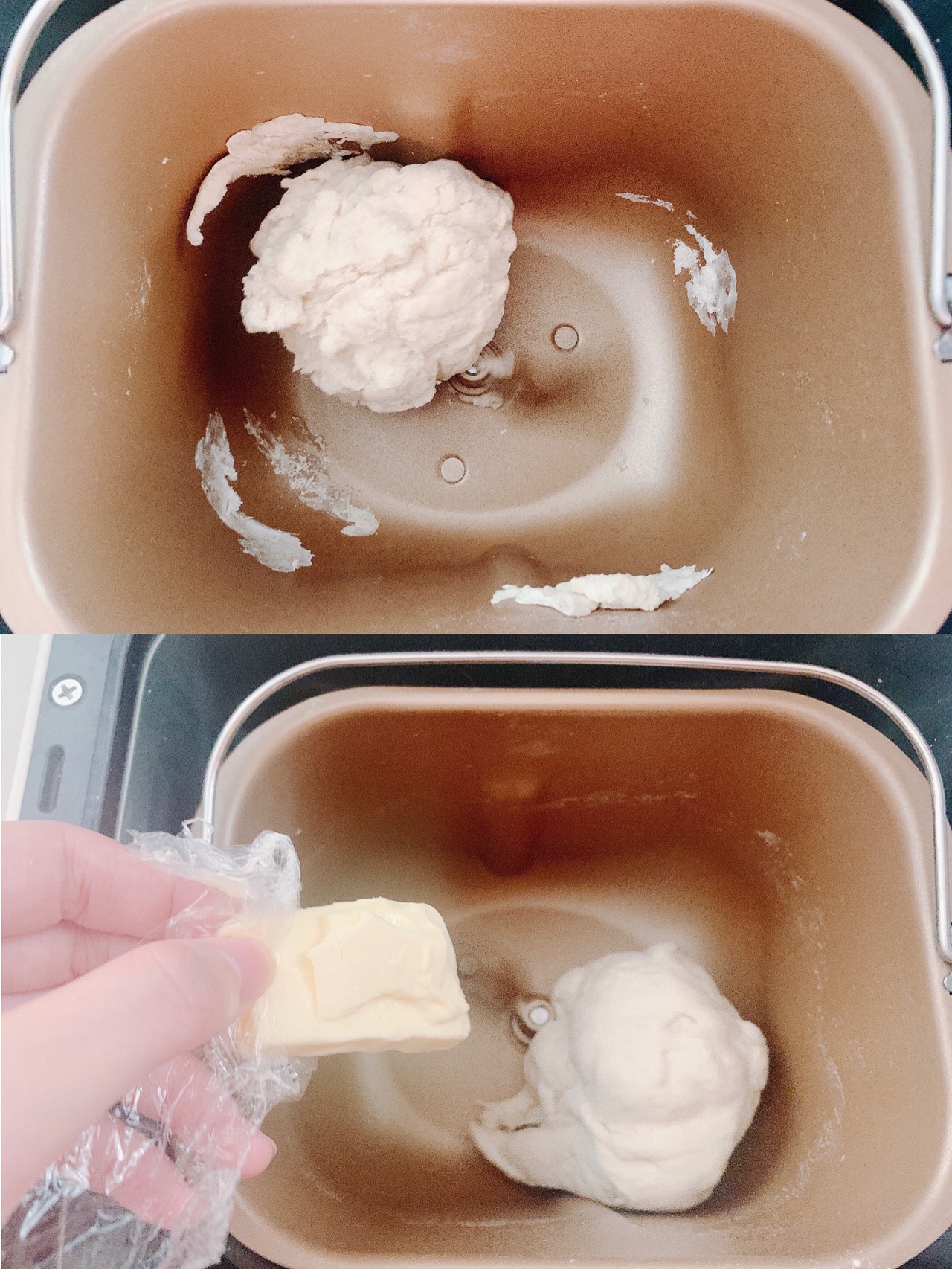 步骤1、将除黄油之外的面团材料放入面包桶内,设置15分钟自定义搅拌程序;程序停止后放入软化的黄油,再次设置15分钟搅拌程序。