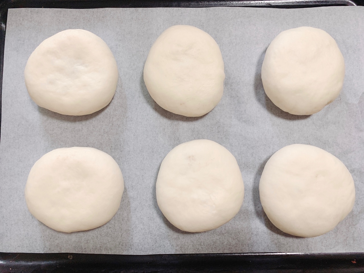 步骤4、松弛结束后,取出一个面团用手压扁,包入蜜红豆收口,再轻轻压扁放入烤盘中。