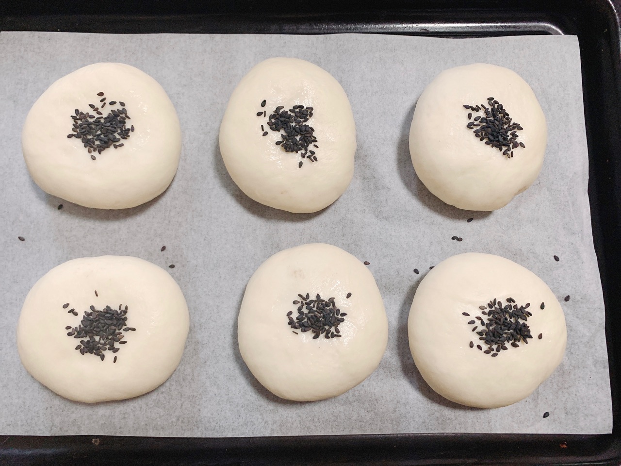 步骤6、接下来将面团进行第二次发酵,发酵完成后在面团表面刷点水,撒上黑芝麻。