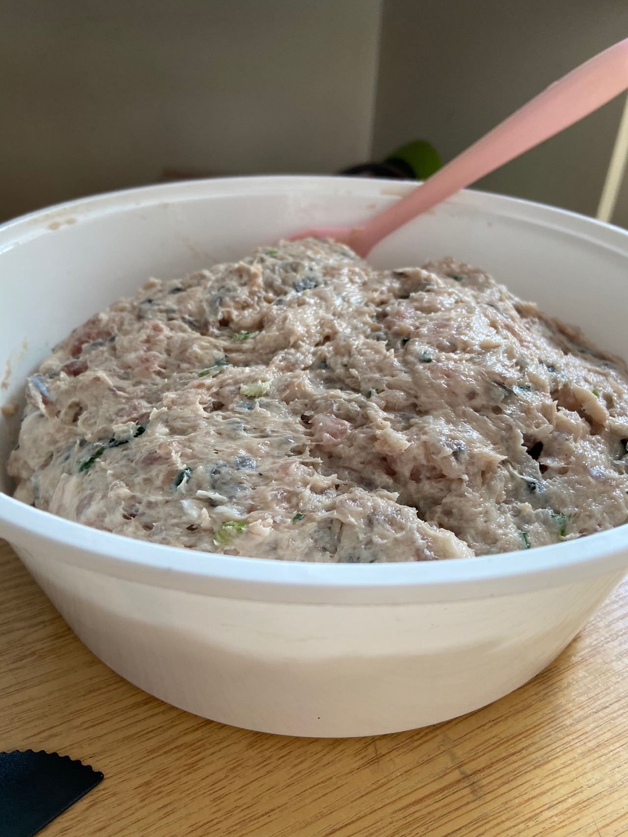 步骤1、把鲮鱼肉和猪肉处理干净,剁碎,放冰箱冷冻一小时后取出,把全部调料放进去搅拌均匀,用厨师机搅打至起胶备用