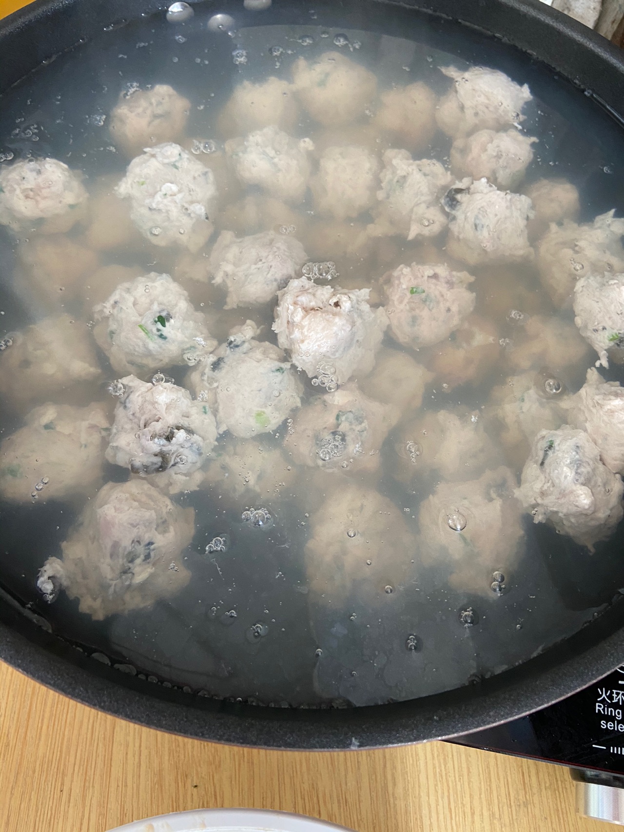 步骤2、锅里烧热水,水未完全沸腾前把鱼丸挤出来用匙羹取出放入锅中
