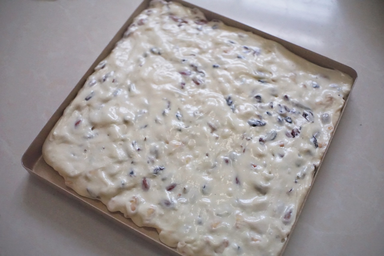 步骤5、最后倒入杏仁、黑加仑干、蔓越莓干和葡萄干搅拌均匀