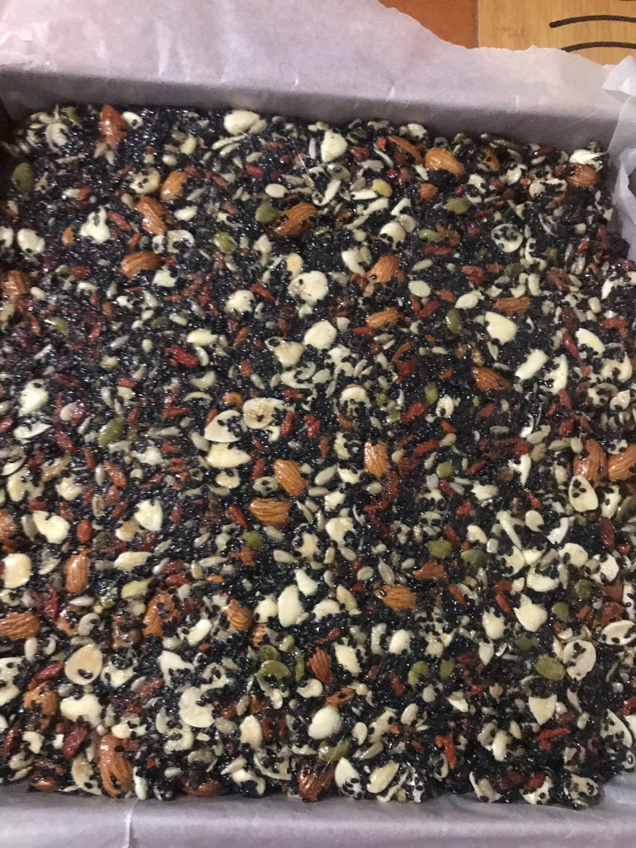 辅料:大杏仁250克、杏仁片250克、南瓜仁瓜子仁100克、黑芝麻500克、核桃仁250克、枸杞子100克