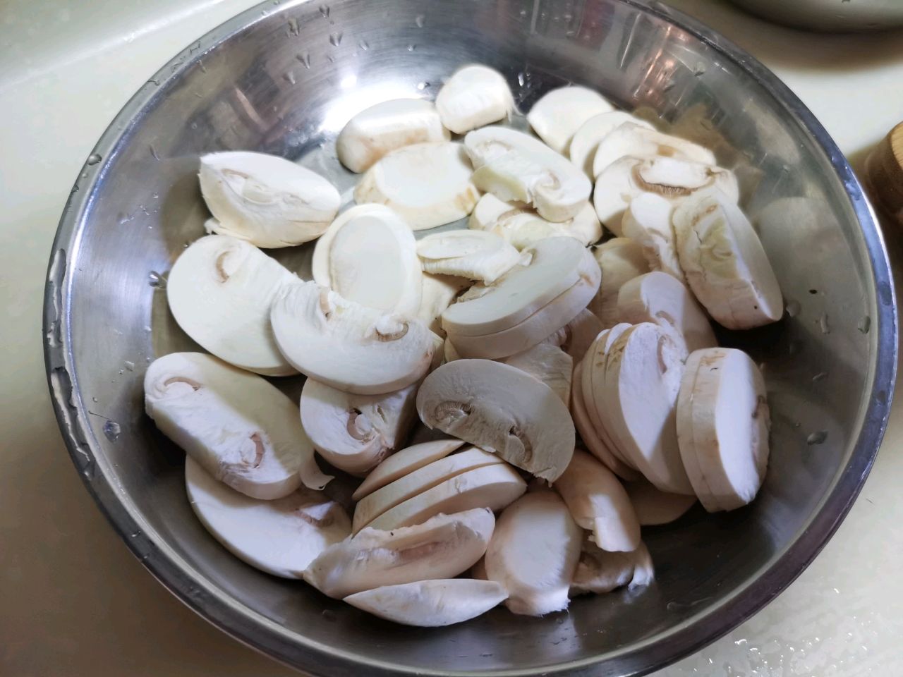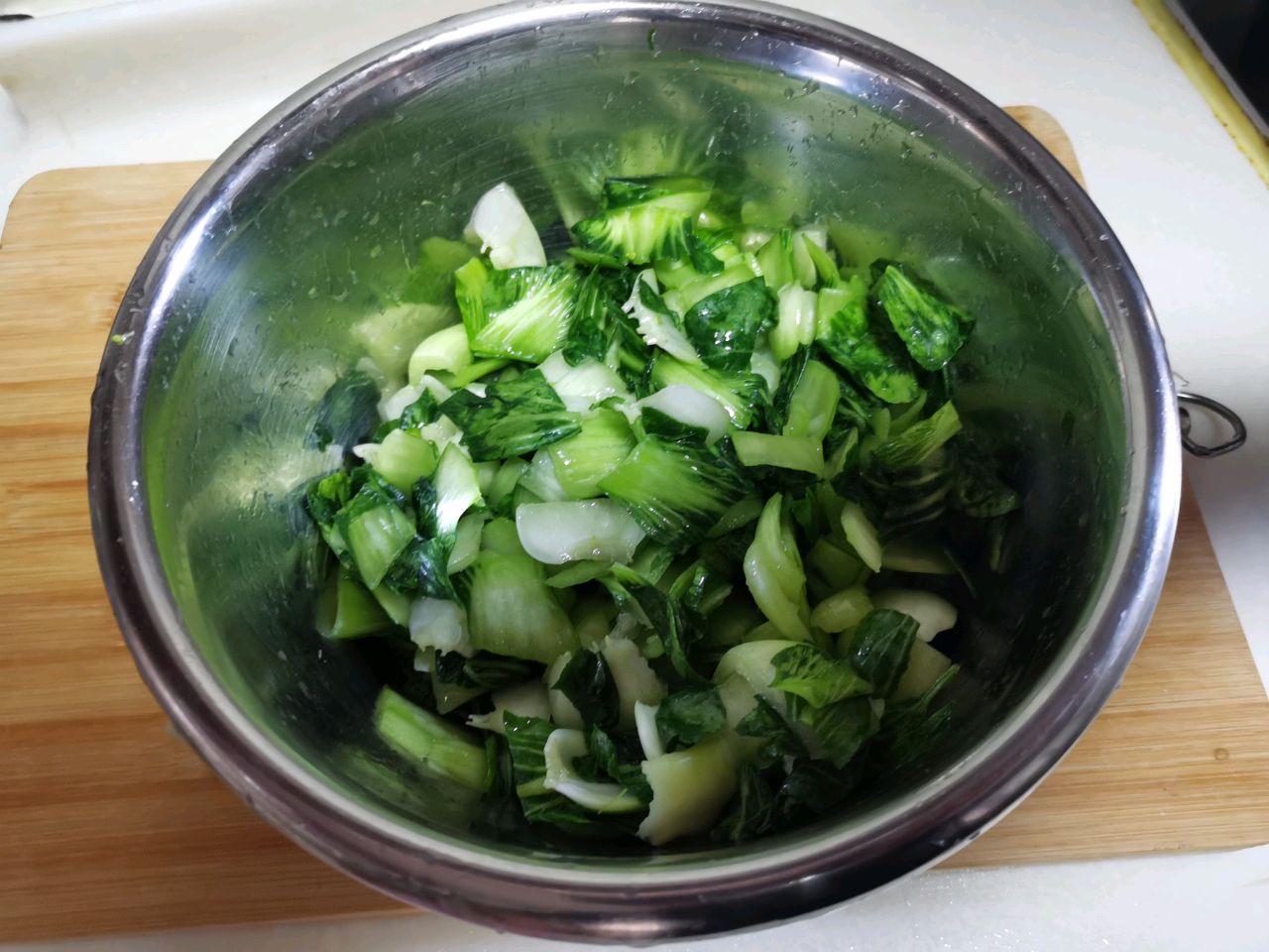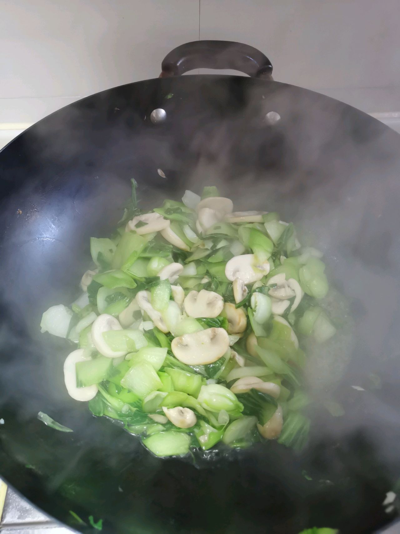 步骤8、起油锅放入白蘑煸炒一下,然后加入手捏青菜