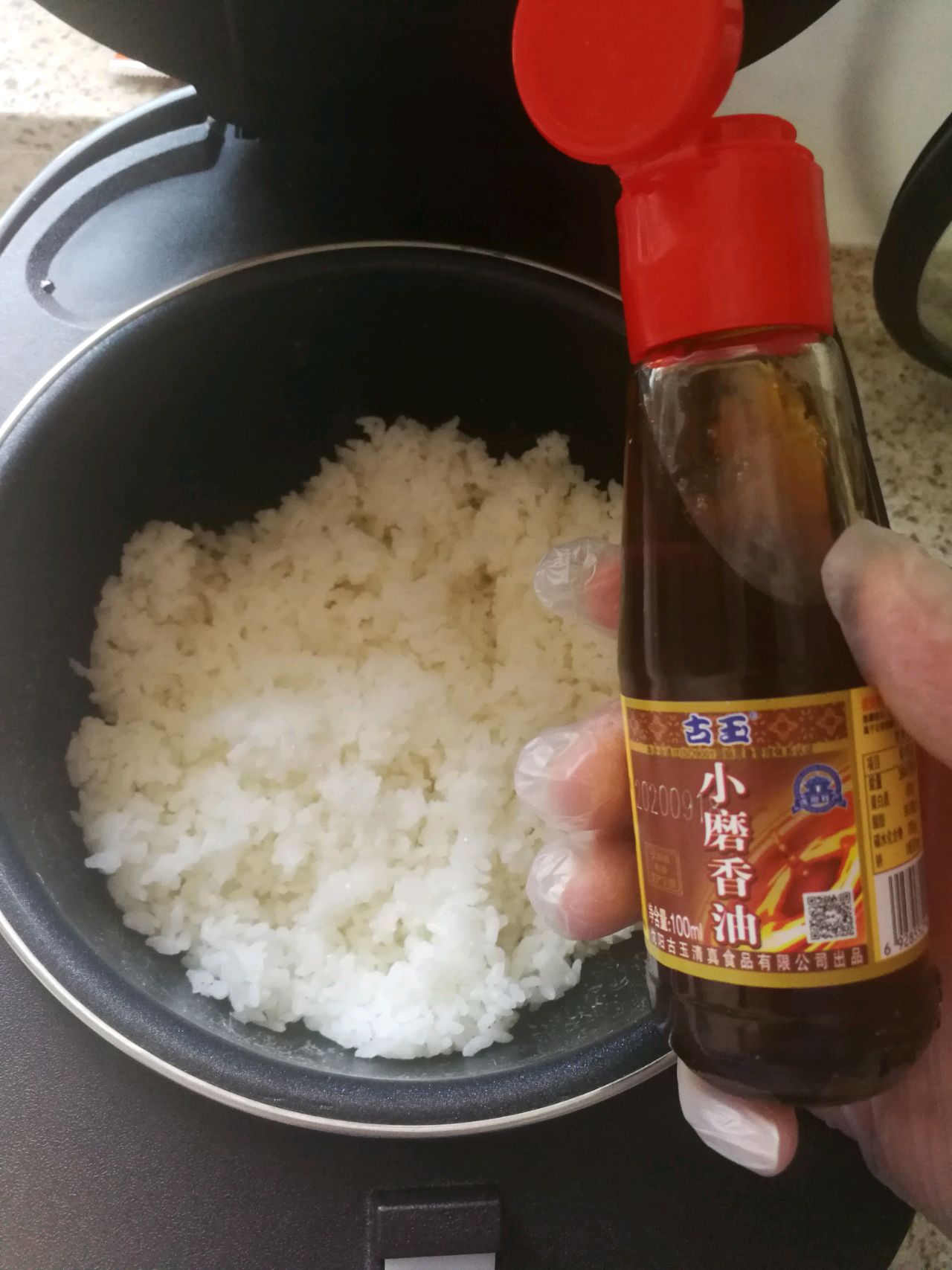 步骤13、戴上手套,用手拌饭。